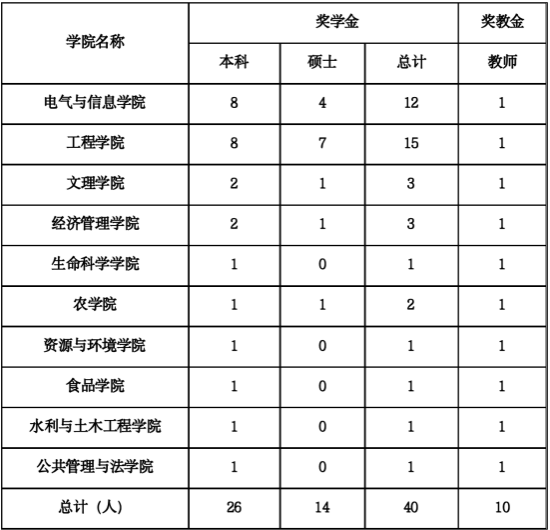 比亚迪奖学金用于奖励品学兼优、综合素质突出的学生,奖励40名学生,其中本科生26人,硕士生14人,本科生每人10000元,硕士生每人20000元。主要奖励电气与信息学院、工程学院、文理学院、经济管理学院、生命科学学院、农学院、资源与环境学院、食品学院、水利与土木工程学院、公共管理与法学院等10个学院全日制在读的全日制二年级及以上在读本科生、硕士生。设奖学科为农业工程、计算机科学与技术、工商管理、机械工程、电气工程、化学工程与技术、软件工程、化学、材料科学与工程、动力工程及工程热物理、环境科学与工程、土木工程、轻工技术与工程、食品科学与工程、生物学、水利工程、生物工程、生物医学工程、大气科学、地理学。(比亚迪在各高校重点奖励学科)