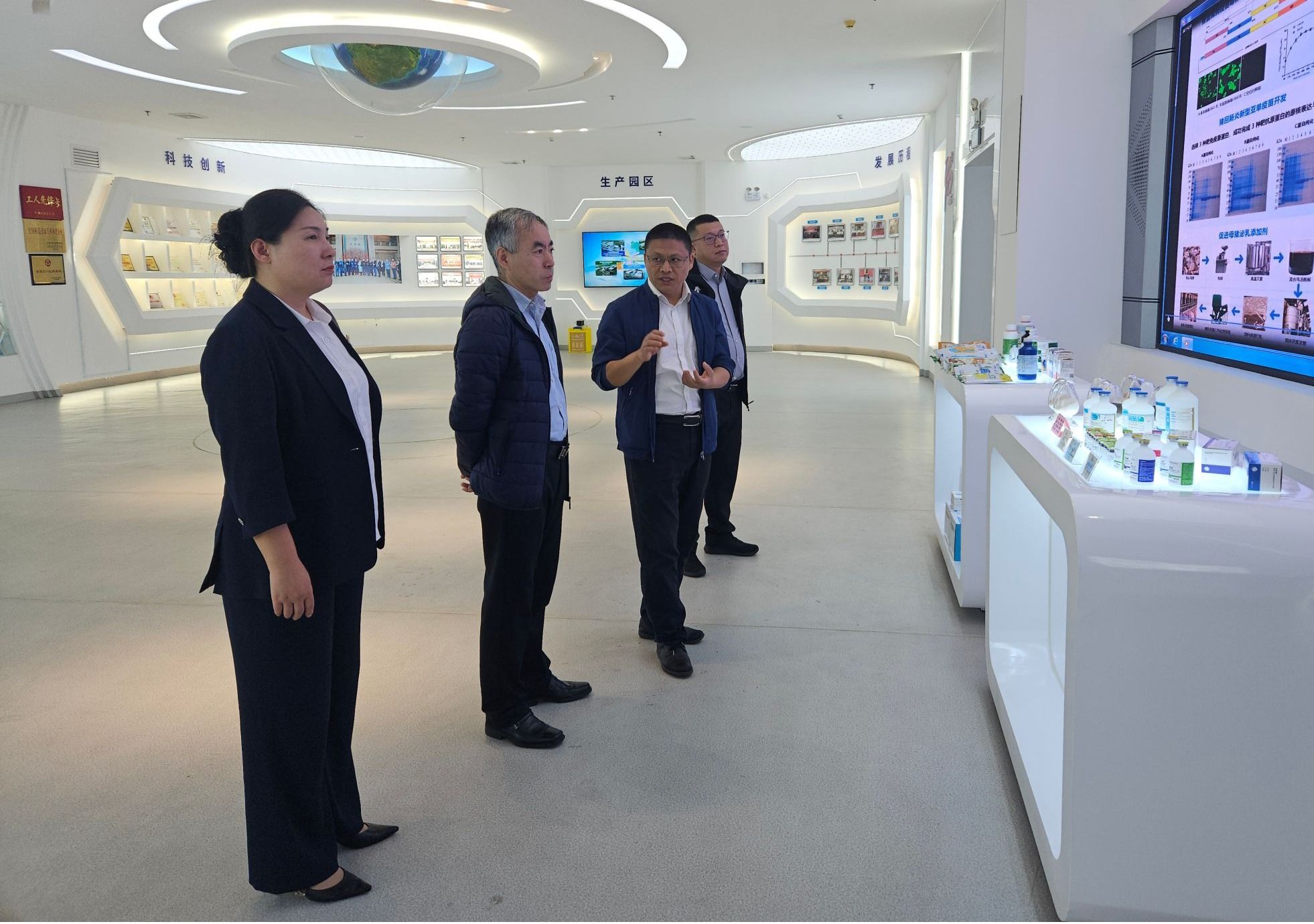 在大华农有限公司,孙占峰一行参观了大华农展示馆、大华农新兴园区,并与董事长陈瑞爱、副总裁王阿明等企业负责人座谈交流,详细了解企业在生物医药、动物疫苗等领域的研发进展与人才规划。