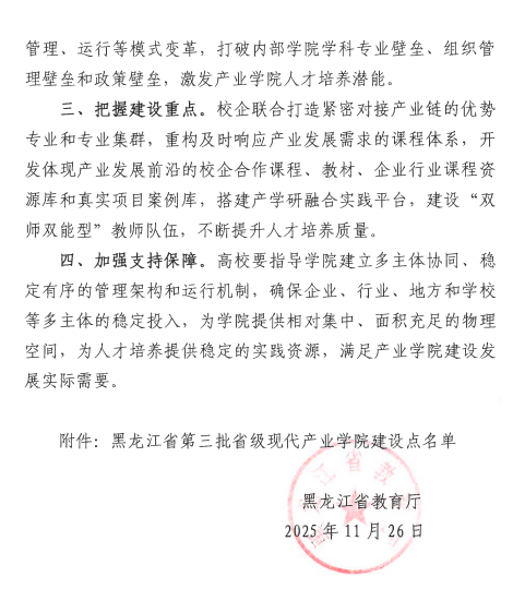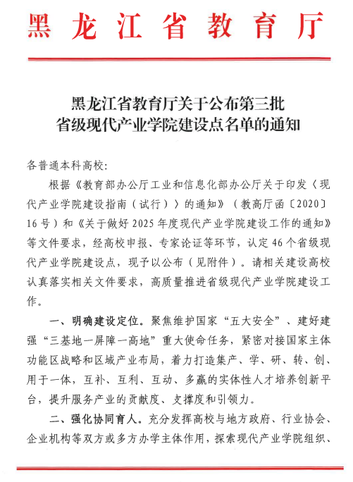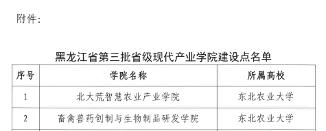 近日,黑龙江省教育厅公布了第三批省级现代产业学院建设点名单,我校推荐的“北大荒智慧农业产业学院”和“畜禽兽药创制与生物制品研发学院”成功入选,目前,我校省级现代产业学院数量达到4个。