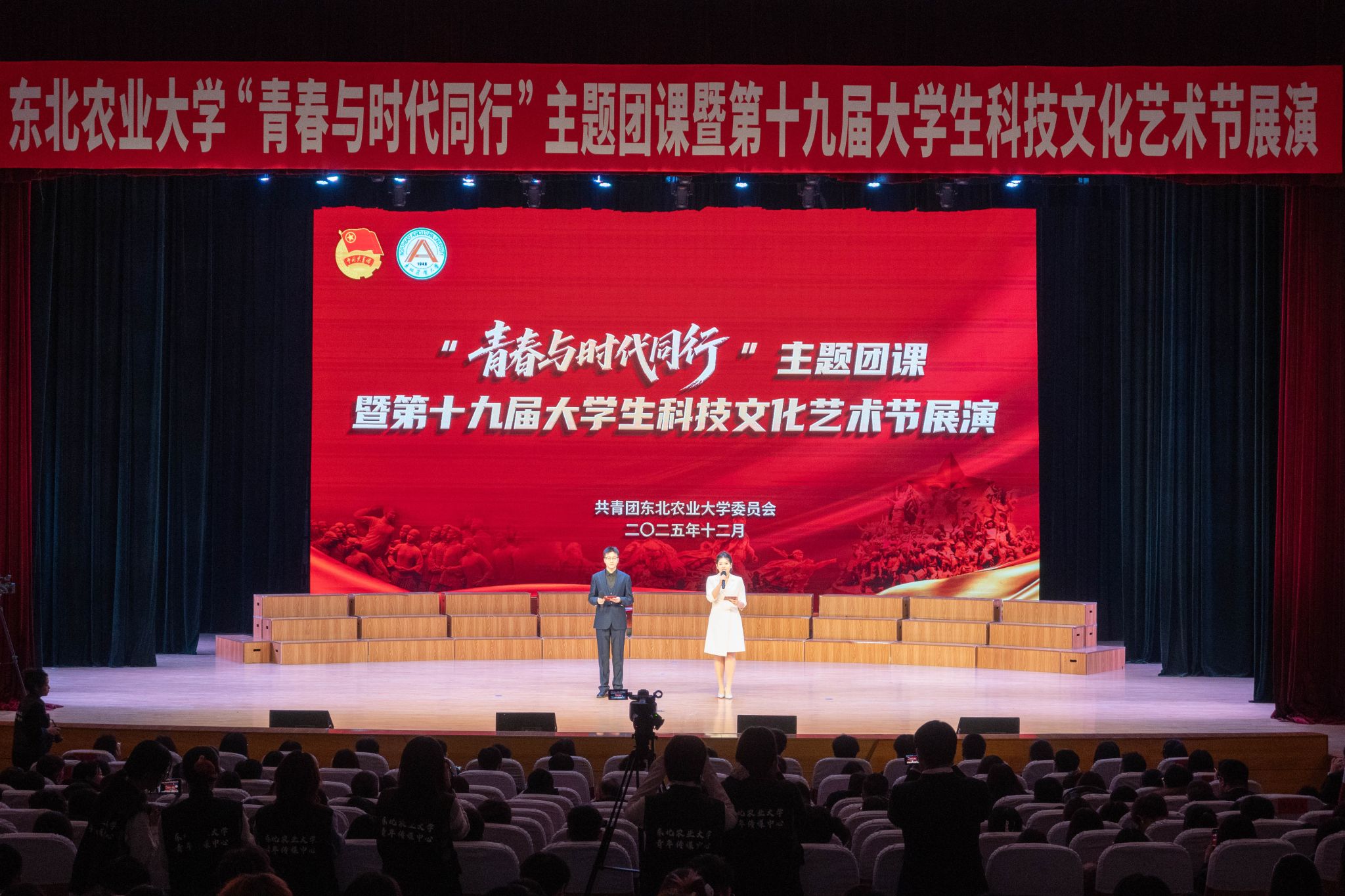 为进一步弘扬爱国主义精神,加强青年历史观教育,繁荣校园文化,全面展示青年学子在学习生活、创新实践、美育浸润中的青春风貌,12月17日晚,我校“青春与时代同行”主题团课暨第十九届大学生科技文化艺术节展演在音乐厅举办。校党委书记付强,党委副书记孟炎,组织部部长吴立全,宣传部、学生工作部(处)、招生就业处等职能部门主要负责人和各学院党委书记、党委副书记、团委书记、全体辅导员及千余名青年师生代表观摩活动,凝聚奋进力量、共话使命担当。