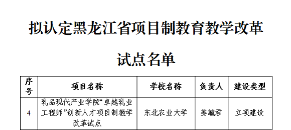 12月23日,省教育厅公布了“关于高校项目制教育教学改革试点名单的公示“,由我校食品学院牵头申报的《乳品现代产业学院“卓越乳业工程师”创新人才项目制教学改革试点》成功获批立项建设。该项目依托学校国家级“双一流”学科优势,以及黑龙江省首批现代产业学院—飞鹤乳品现代产业学院,旨在重构乳品工程专业人才培养体系。改革将以乳品全产业链真实项目为牵引,搭建“基础课程+项目模块+综合研创”的课程体系,推行校企双导师、双基地教学模式,建立过程与成果并重的综合评价机制,全力培育“精技术、懂产业、能创新”的卓越工程技术人才,精准对接龙江乳业高质量发展需求。