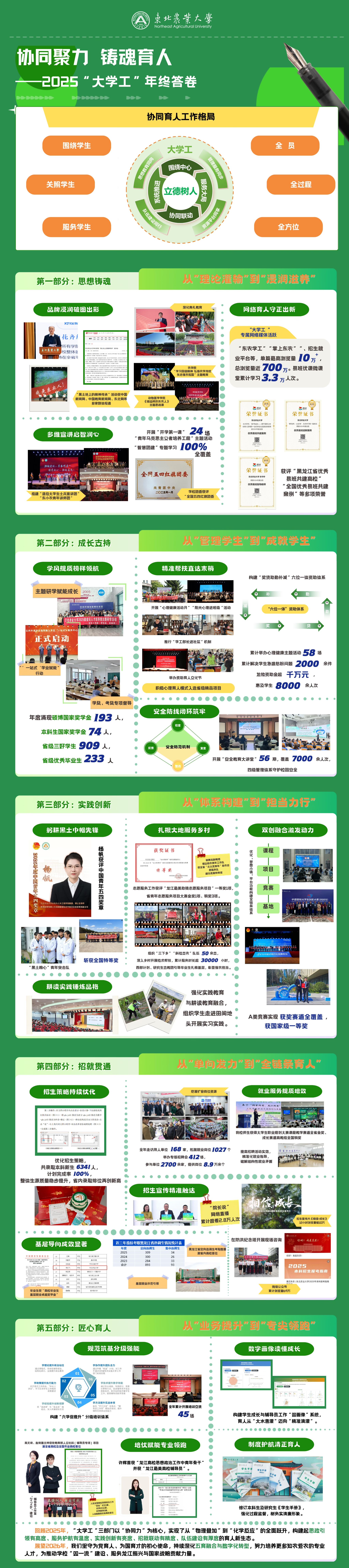 2025年,学生工作部(学生处、武装部)、团委(创新创业中心)、招生就业处坚持以习近平新时代中国特色社会主义思想为指导,深入学习贯彻党的二十大和二十届历次全会以及全国教育大会精神,全面学习贯彻习近平总书记视察我省期间重要讲话重要指示精神,认真落实学校第四次党代会决策部署,以立德树人为根本,以强农兴农为己任,秉持“围绕中心、服务大局、协同联动、系统推进”的工作理念,突出“一盘棋”思维,着力构建“大思政、大学工、大协同、大服务”工作格局,推动育人工作与学校“双一流”建设同频共振,初步形成“思想教育同向、管理服务同步、资源平台同享、队伍建设同行”的协同机制,全面提升各项工作的系统性、精准性和实效性,取得了一系列扎实的工作成效。