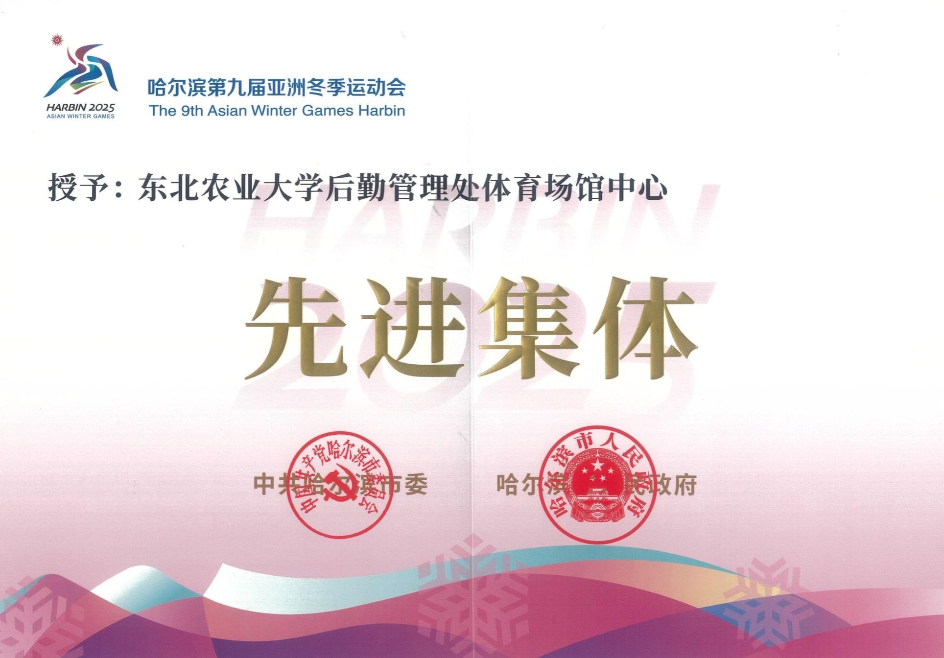 2026年2月7日,在第九届亚冬会成功举办一周年之际,哈尔滨市隆重举行总结表彰大会,我校后勤管理处体育场馆中心被哈尔滨市委、市政府授予先进集体荣誉称号。