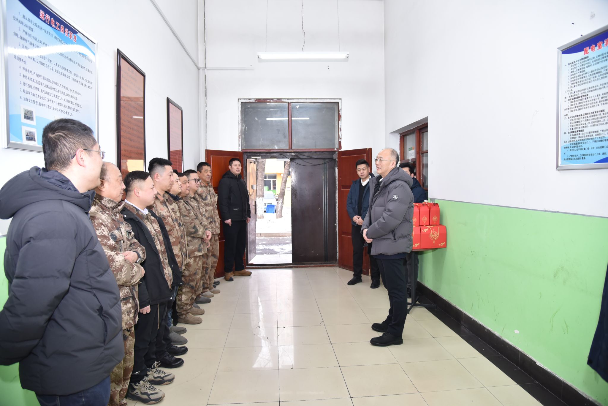 校领导一行首先来到北区变电所。值班人员正认真巡查供电线路、监测设备运行、详实记录数据,坚守在电力保障一线。付强详细了解节日值班安排与安全保障情况,对大家常年坚守、履职尽责表示衷心感谢:“校园安全责任重大,节日供电更是重中之重。大家在平凡岗位上作出了不平凡的贡献,为学校教学科研和事业发展提供了坚实可靠的电力保障,辛苦了!”他叮嘱大家注意防寒保暖、严守安全规程、确保万无一失。一句句家常话,让值守的岗位间暖意融融。工作人员坚定说道,“请学校放心!一定守好电力保障岗,确保校园用电安全平稳!”