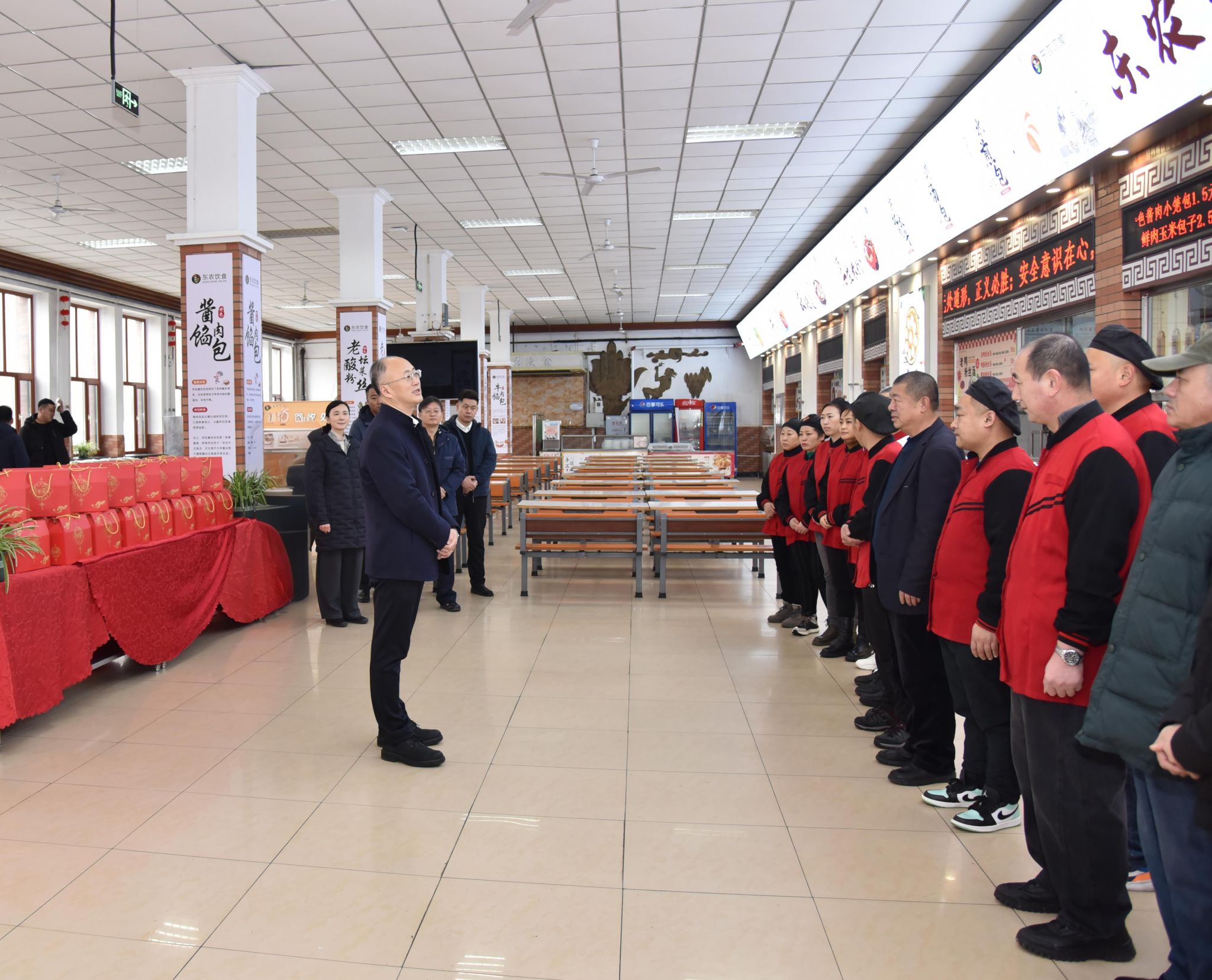 最后,校领导一行来到棘园餐厅。张灯结彩的餐厅里热气腾腾、香气四溢,餐饮工作人员笑容朴实、精神饱满。付强笑着说道:“大家都说东农是‘惯孩子的学校’,学校多年在软科中国大学生食堂满意度评选中位居榜首,这份优异成绩的取得,得益于全体后勤人心往一处想、劲往一处使,是大家爱校如家、当好主人翁的生动体现。年终岁尾来看望大伙儿,大家辛苦了,感谢大家用心守护留校师生的‘舌尖年味’!”