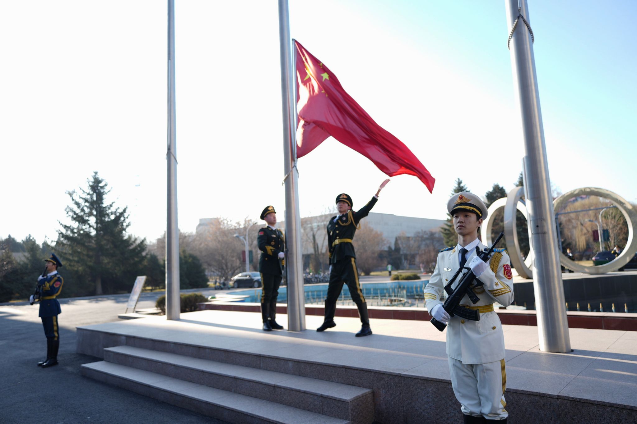 清晨的主楼广场庄严肃穆,迎着初升的朝阳,国旗护卫队队员身着整齐制服,迈着坚定整齐的步伐,护送五星红旗缓缓入场。当雄壮嘹亮的《义勇军进行曲》奏响,五星红旗冉冉升起、迎风飘扬,全体师生庄严肃立,行注目礼,目光紧紧追随国旗,心中既涌动着对祖国的无限热爱与崇敬。