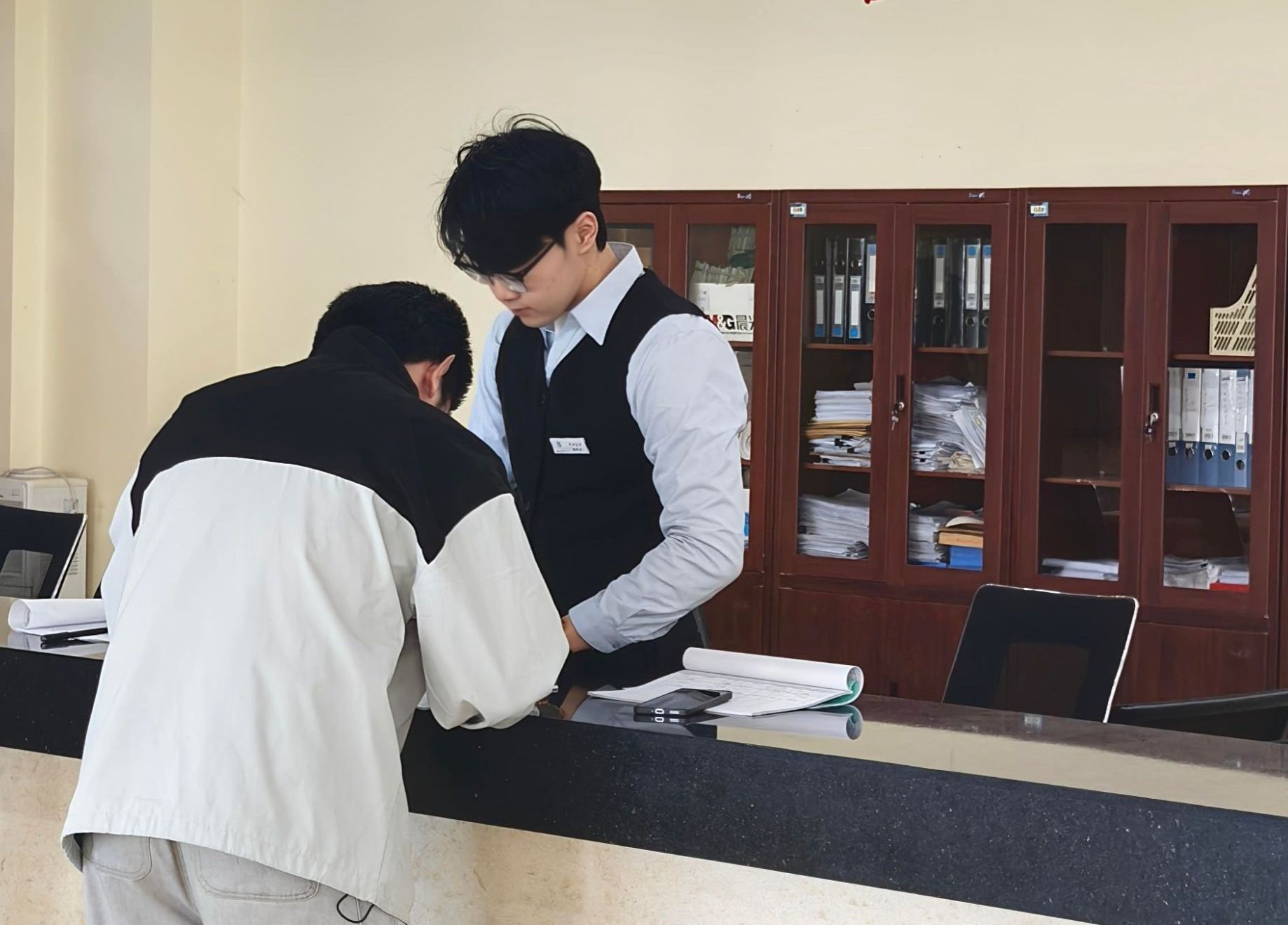 这支由30余名学生助理组成的队伍,年均服务师生超万人次。开学季是中心最像“战场”的时候。学生证补办、注册盖章,材料在桌上摞成小山,一天下来要处理两百多份,接待上百人。公共管理与法学院学生杨钧涵记得,最忙的时候,一上午连口水都顾不上喝。但比起忙碌,他记得更清楚的,是那些让他觉得“这件事做得值”的瞬间。