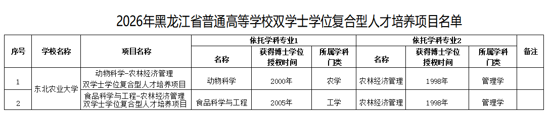 近日,黑龙江省学位委员会正式公布2026年普通高等学校双学士学位复合型人才培养项目和联合学士学位培养项目名单。我校申报的“动物科学—农林经济管理”与“食品科学与工程—农林经济管理”2个双学士学位复合型人才培养项目全部获批。这是学校主动适应国家重大战略需求,深化教育教学改革,推动学科深度交叉融合、创新复合型人才培养模式的又一重要成果。