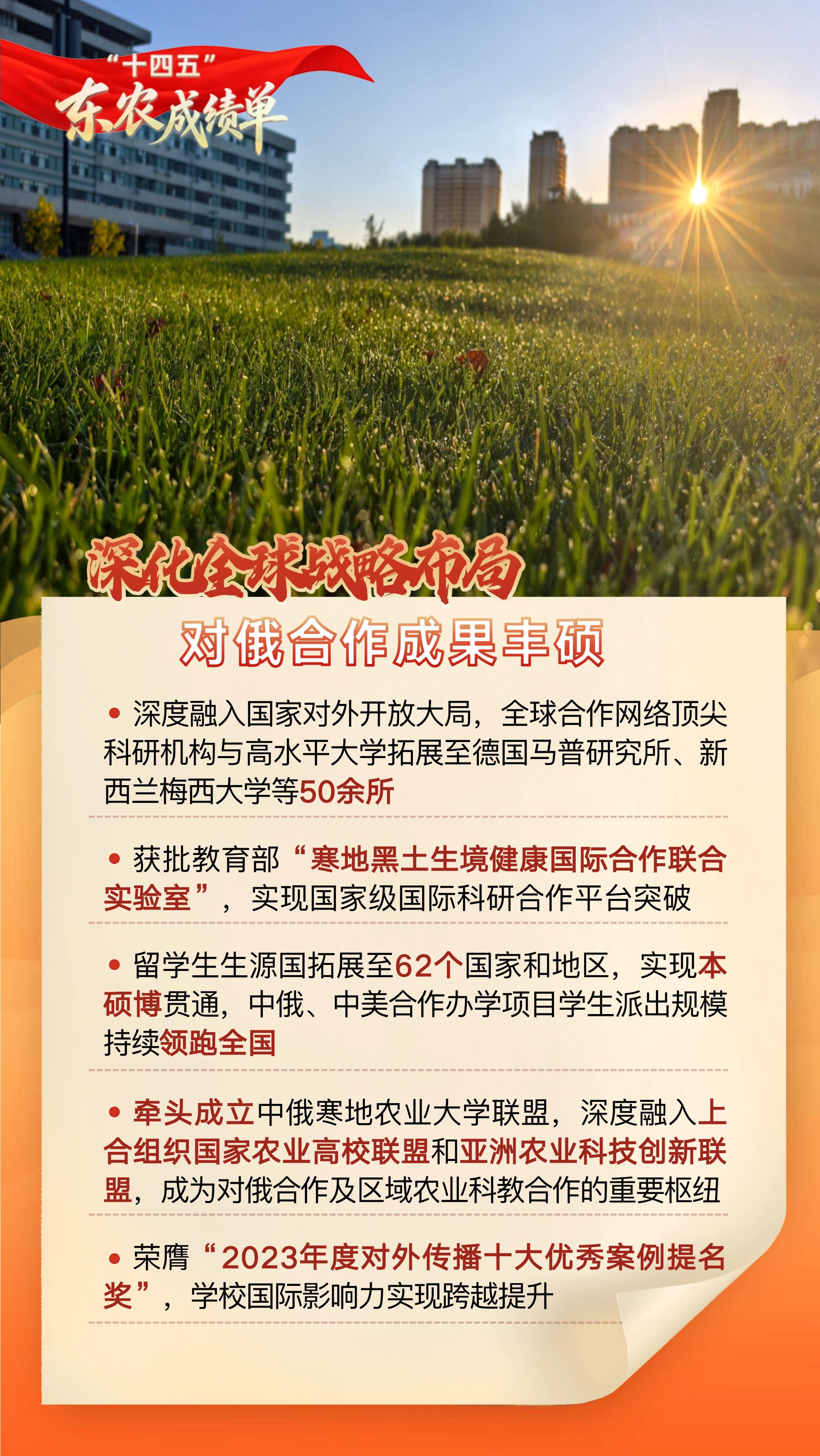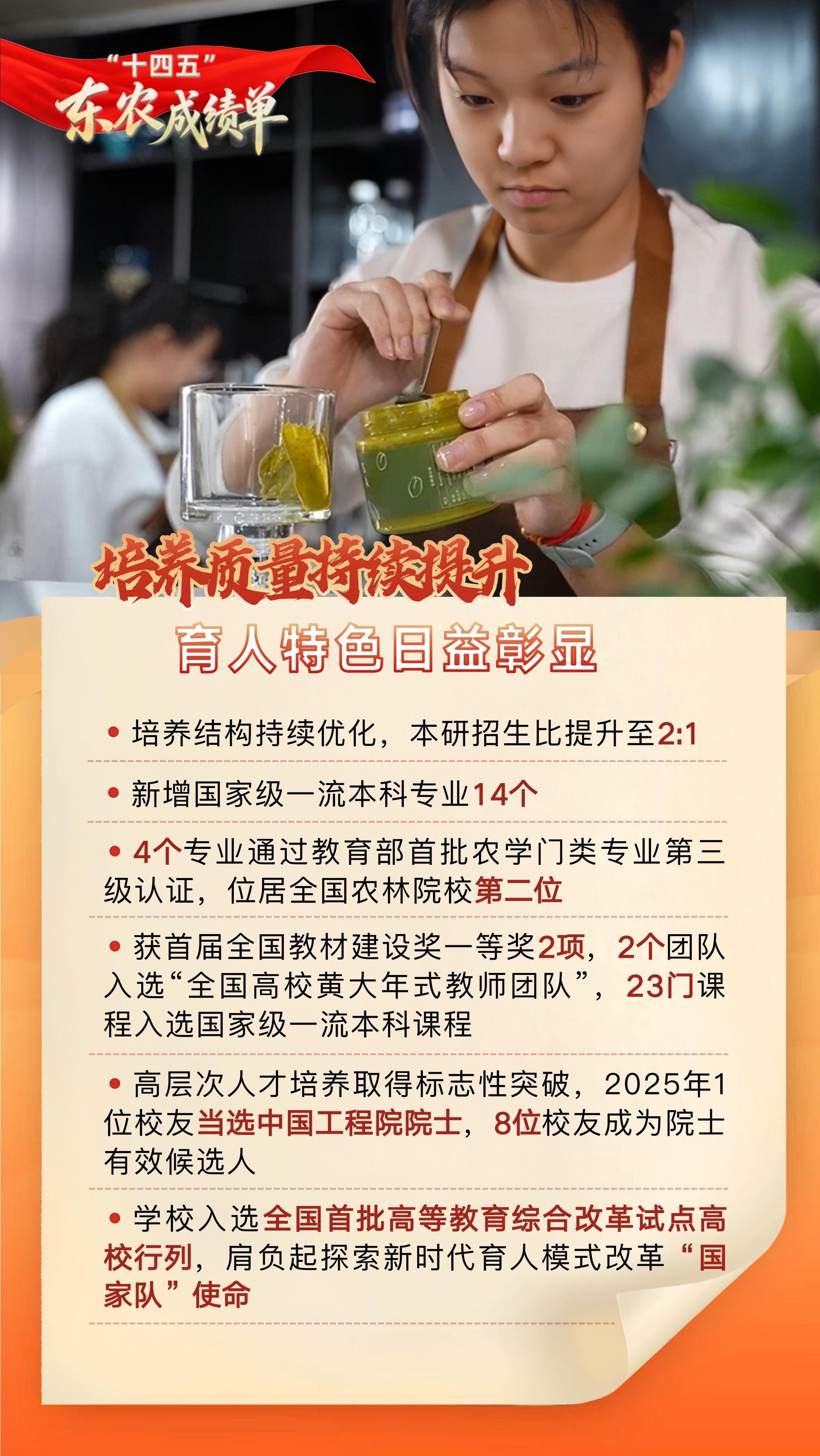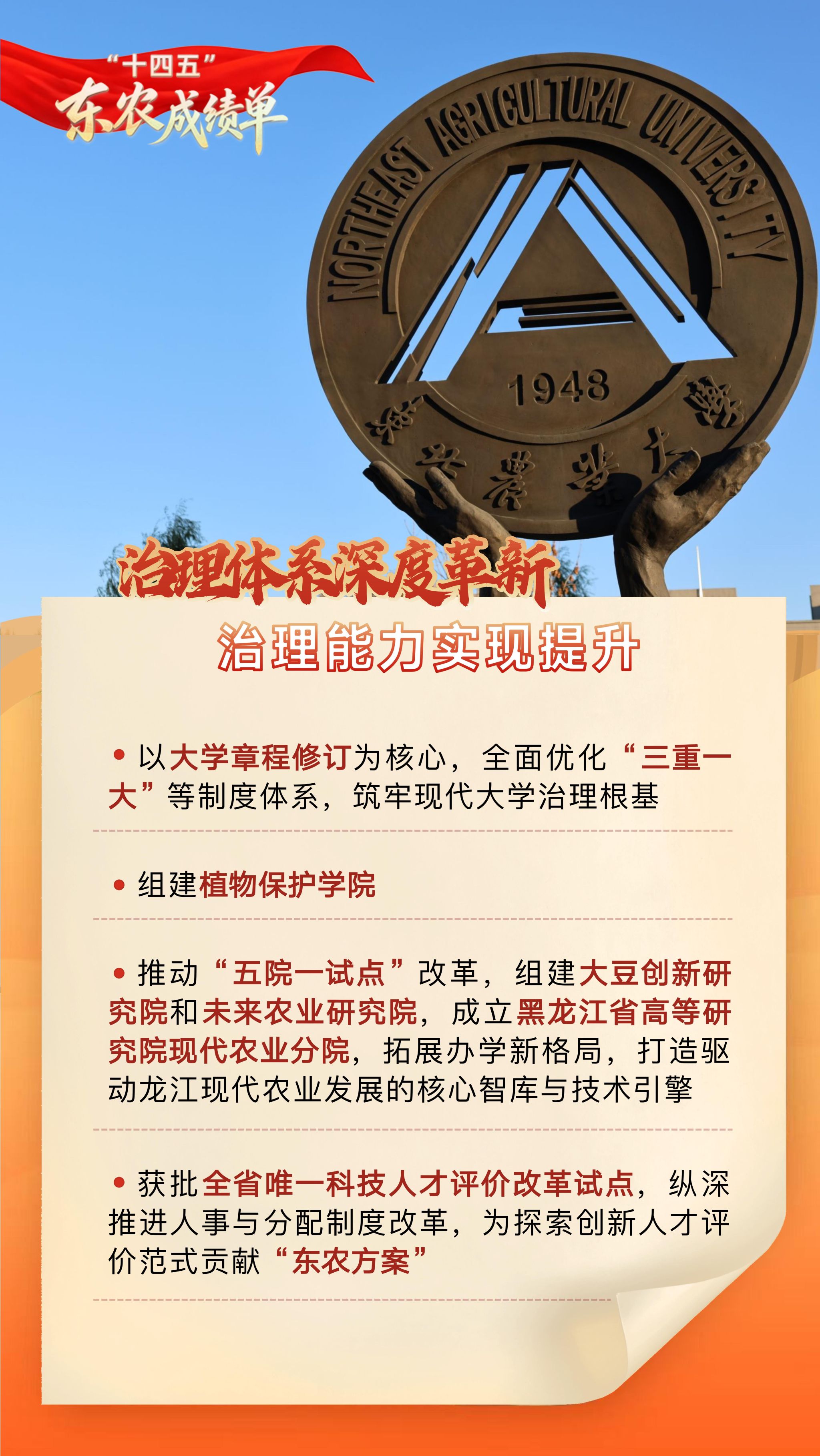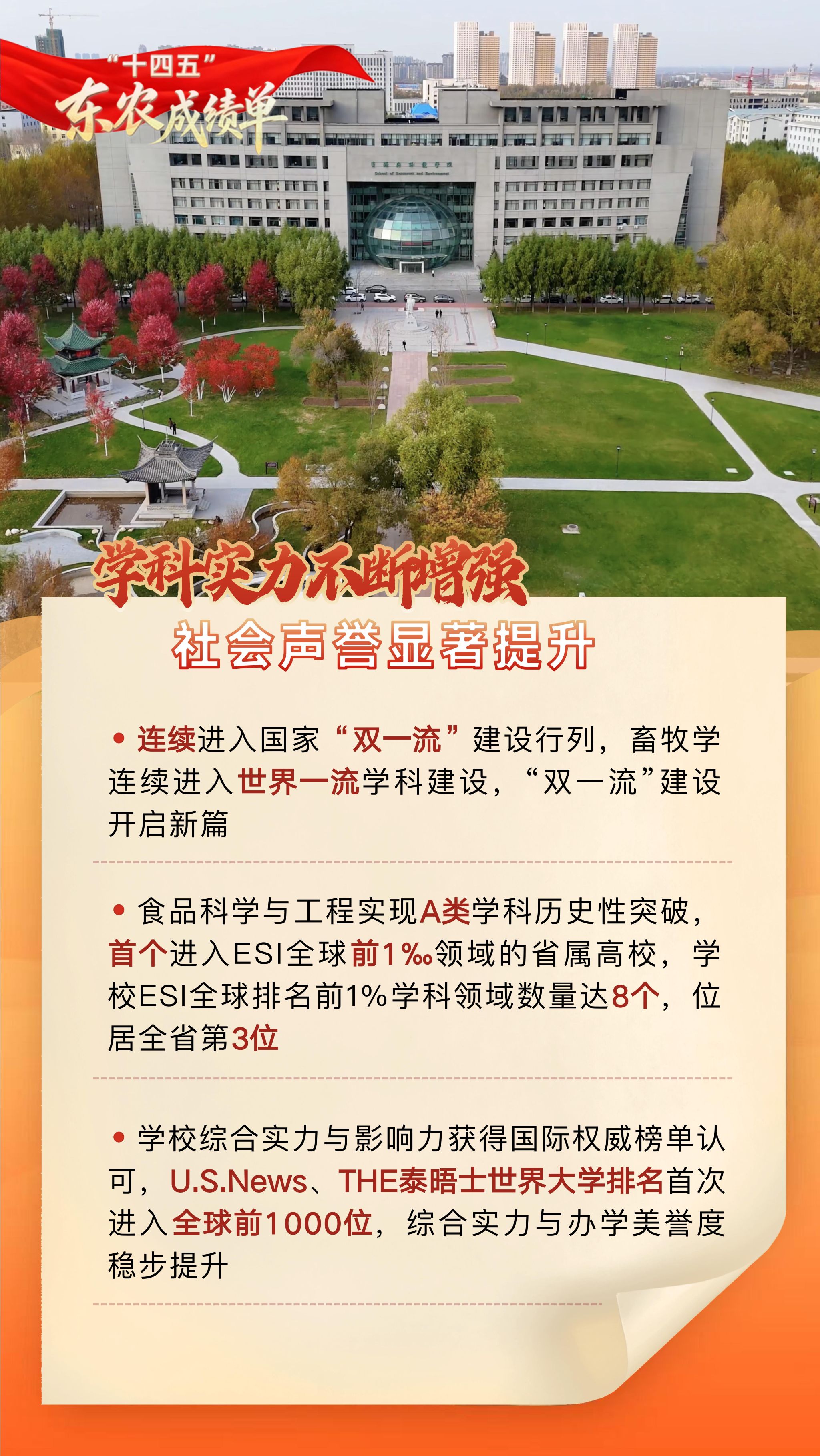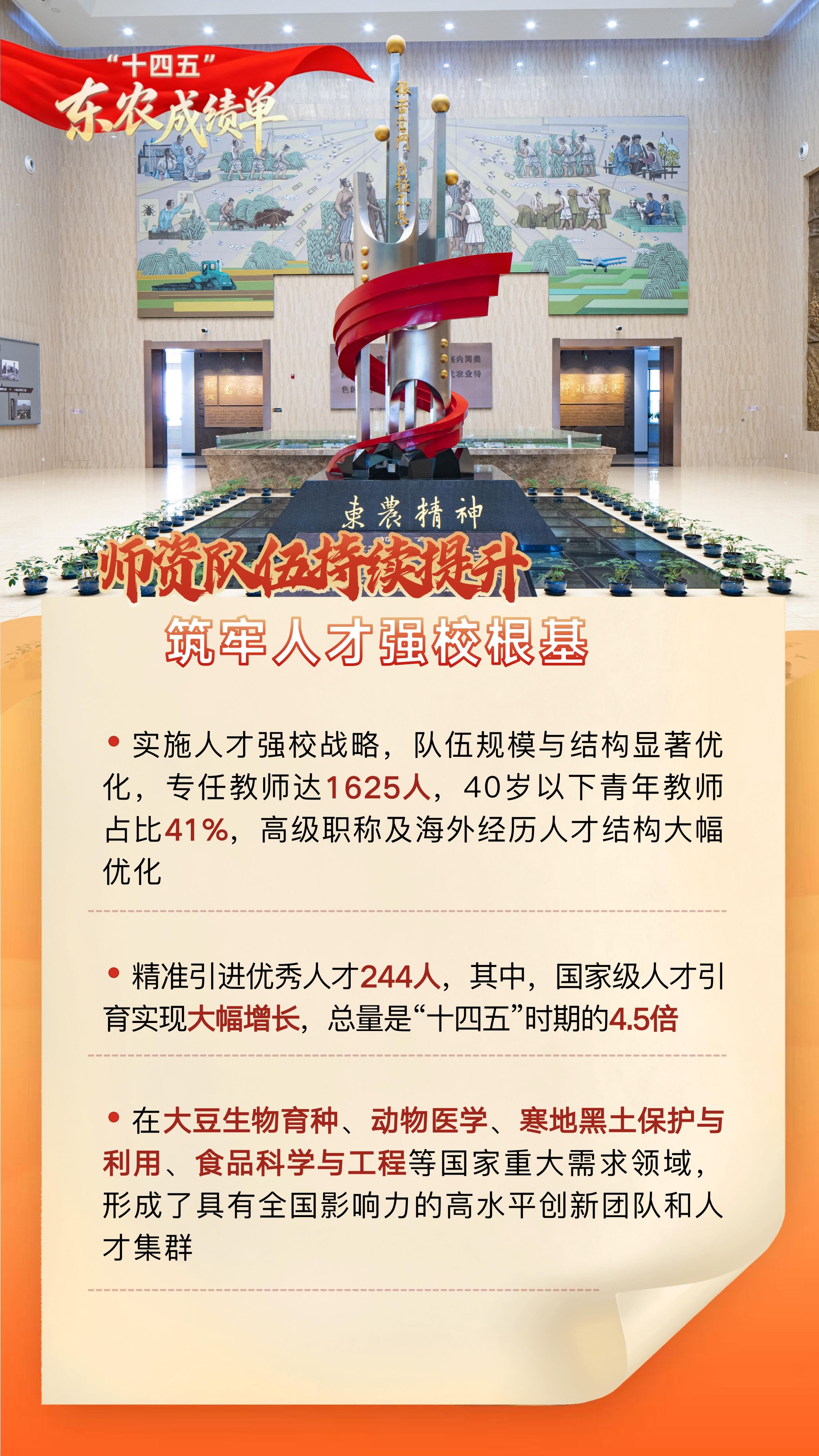【编者按】“十四五”时期,是东农人砥砺深耕、拔节生长的五年。学校始终坚持以党的教育方针为指引,全面深化内涵建设,聚力攻坚改革创新,主动融入国家战略与区域发展大局,以奋进之笔写就了内涵深厚、特色鲜明、服务有力的高质量发展新篇章。