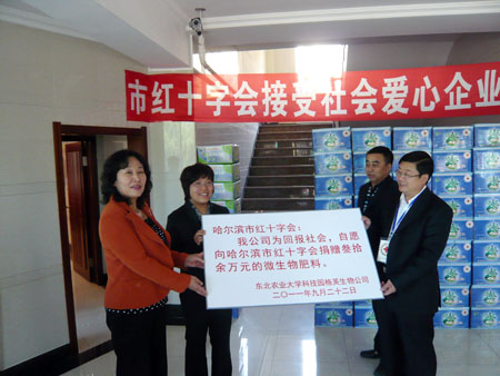 9月26日,哈尔滨市红十字会爱心捐赠仪式在红十字会救灾捐助中心正式举行,入驻我校科技园的哈尔滨绿农生物技术有限公司向哈尔滨市红十字会捐赠价值三十余万元的生物肥料。哈尔滨市红十字会授予东北农业大学科技园人道博爱奉献奖,授予哈尔滨绿农生物技术有限公司技术总监崔正中教授人道博爱奉献奖杯。