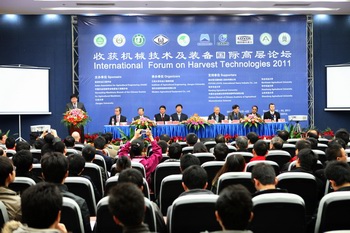 蒋亦元院士在论坛作的报告题为“中国农业收获机械现状与发展方向”。在报告中,蒋院士就收获机械的整体发展现状、收获机械技术、收获机械发展中存在的问题、收获机械的未来发展方向等方面进行了宏观论述。报告指出,我国国有农场主要农作物实现了机械化收获,而农村机械化作业程度低。但黑龙江省通过政府30%的购机贴补,促进农村快速建立机械化合作社,这将使机械化程度与土地的集中显著提高。在谈到收获机械技术时,蒋院士从谷物(稻、豆、麦)收获机械、玉米收获机械、棉花收获机械、油菜收获机械等方面列举了收获机械技术的主要技术特点,并对我国在智能化和信息化的研究与应用方面的现状进行了介绍。4日上午,蒋亦元院士作了题为“Rice Stripping Combine Harvester with simultaneously Cutting & Windrowing the Straw”(同时切割稻草成条铺的割前摘脱联合收获机)的英文报告,将自己研制的割前摘脱联收机工作原理向与会人员进行了介绍,用照片和视频等形式展示了机器的作业过程及作业效果。在报告最后,蒋院士强调了知识产权的重要性。报告得到与会代表的一致认可和高度评价。