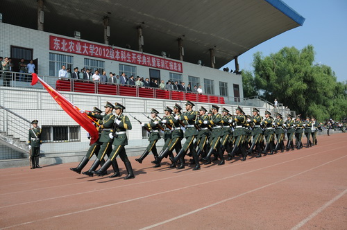 9月7日上午,东北农业大学2012级本科生开学典礼暨军训汇报表演在体育场隆重举行。校党委书记、校长徐梅,新生军训师政委、校党委副书记胡国良,校党委副书记郭翔宇,新生军训师师长、副校长秦智伟,副校长刘荣,纪委书记孙立军,苏宁团副团长尹学民以及全体军训教官,学校各相关部门领导,全体辅导员,全体2012级新生参加了典礼。典礼由胡国良主持。
