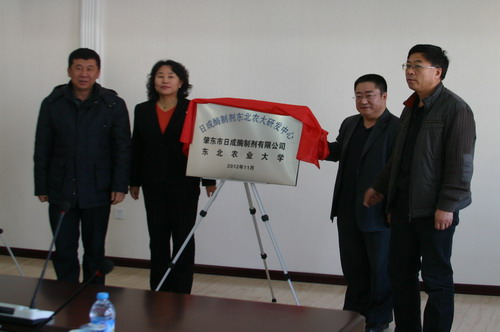 郑秋鹛与来宾一同为“日成酶制剂东北农大研发中心”揭牌