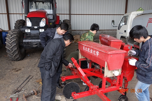 5月3日,我校玉米秸秆还田联合机械化耕作技术示范项目负责人杨悦乾研究员、龚振平教授,在我校望奎挂职副县长寇胜利陪同下,一行六人带着刚刚在五一假期赶制完成的2台免耕播种机,来到项目实施地点望奎县火箭镇二段村玉米种植示范区进行现场组装机器和试播调试。
