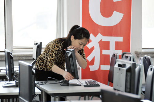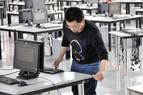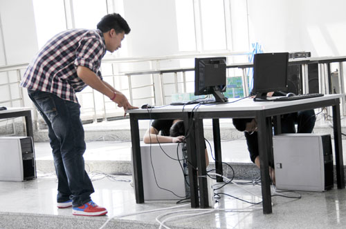 在成栋楼二楼多功能厅比赛场地记者看到,800余平方米的场地已经按照比赛需要清扫、整理完毕,醒目的赛事背景及条幅已挂置妥当,143台比赛用计算机已安装好,10余位老师正在紧张有序地逐一进行调试。正在布置赛场的电气与信息学院党委书记许海峰告诉记者,比赛现场所用的计算机、服务器、交换机等设备均由电气与信息学院提供,今天一早100多名学生和志愿者从位于三楼的计算机室把计算机、服务器、交换机搬到了赛场,并对赛场卫生进行了认真清理,学院十几位老师对计算机等设备进行了组装,并完成了网络布线和测试,硬件准备现已全部就位。正在现场忙碌的贾银江老师告诉记者,为了给比赛提供最优硬件资源,学校各兄弟单位给予了很多支持,比如比赛现场的电缆、网络布置均由后勤处和网络中心工作人员提供支持,桌椅则是由艺术学院、实验管理处和电气与信息学院共同提供的。