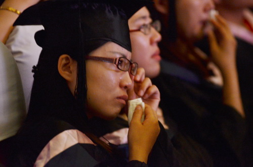 6月19日上午,学校音乐厅里700余名毕业生身着学士服等待着典礼的开始。伴着《东农之歌》的旋律,荧幕上播放起毕业专题纪录片《和你在一起》,片中记录着一片片熟悉的草坪、一张张微笑的面庞、一段段回忆与经历,毕业生代表、教师代表、家长代表共同观看了纪录片,同学们眼含泪水,会场里响起经久不息的掌声。