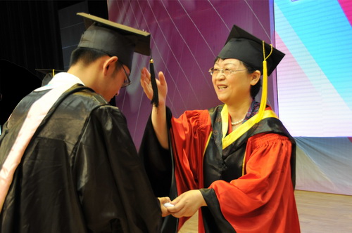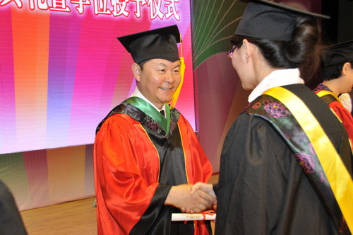 9位校领导身着学位服站在舞台上为毕业生授予学位。上台前,同学们反复整理着自己的学士服,校领导为在场的每名毕业生拨动流苏、授予学位证书,并亲切地握手合影,激动的泪水流淌在同学们的脸上,一句句祝福与叮嘱也留在了同学们的心里。
