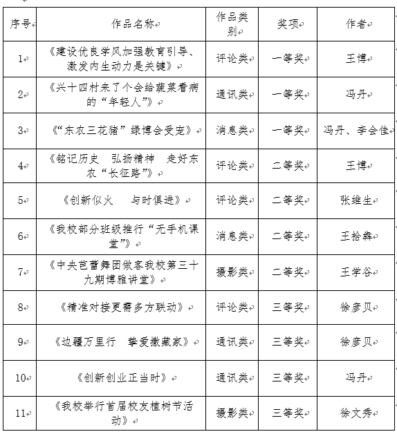 近日,2016年度黑龙江省高校好新闻作品评选结果揭晓,我校共有11篇作品获奖,其中3篇作品获得一等奖;4篇作品获得二等奖;4篇作品获得三等奖。我校获奖作品数量和质量位居全省高校前列。