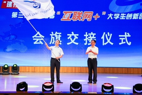 最后,进行了大赛会旗交接仪式,我校党委副书记陈延良代表大赛组委会将大赛会旗交接给第四届大赛承办单位哈尔滨工业大学人员代表。