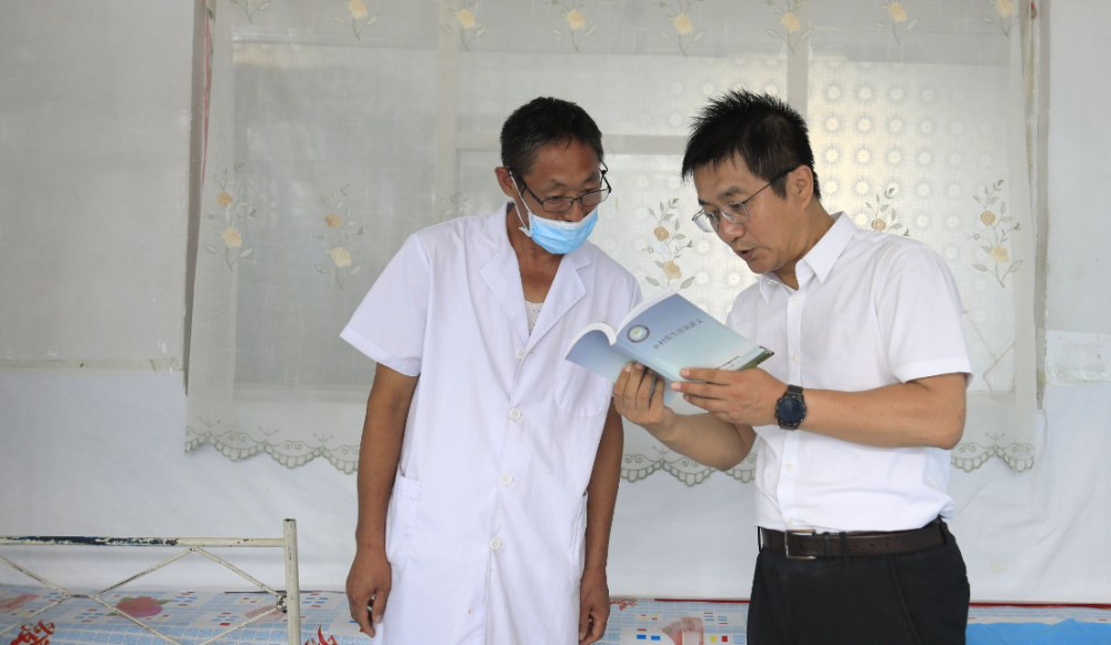 随后,贺景平结合主题教育调研问题,来到东发村卫生室,调研了解村医目前的工作状况、收入待遇情况和想学习掌握的医学知识,向村医邳海利赠送了《乡村医生培训讲义》书籍,并简要介绍了书中的主要知识点,力争通过医疗帮扶、打造一支不走的乡村医疗工作队。