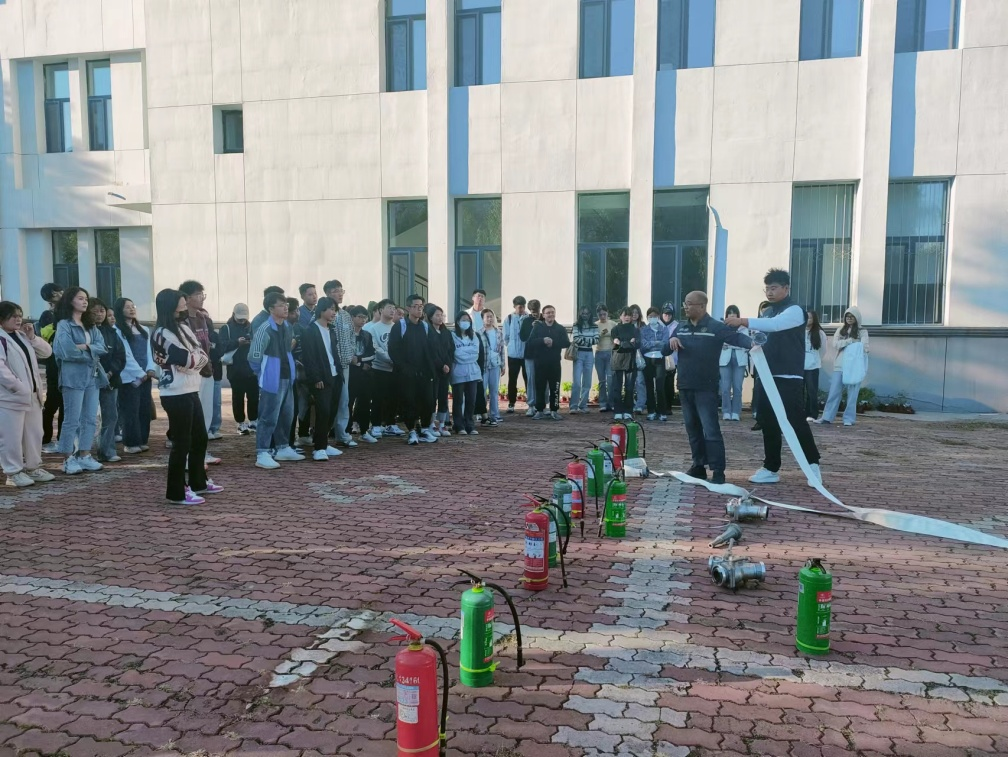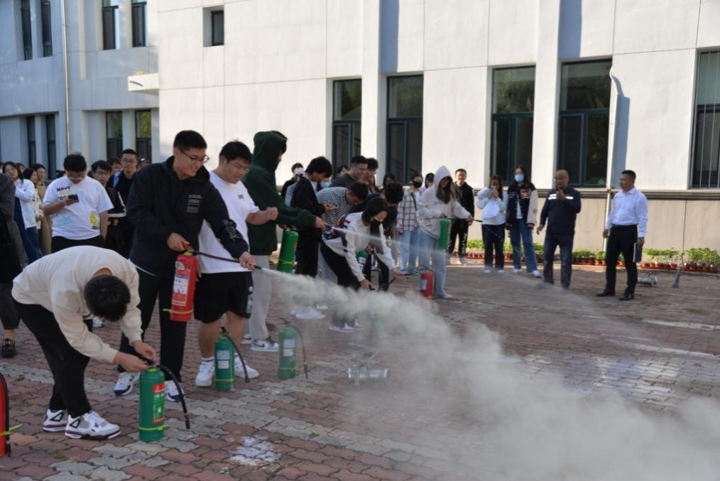 现场培训结束后,保卫处杜波、刘浩东组织与会人员在农学楼南侧空地进行了消防演练,详细讲解了灭火器和消防栓的类型及使用方法。与会师生在保卫处工作人员的指导下,现场观看并亲自操作了消防水带、干粉灭火器、水基灭火器。