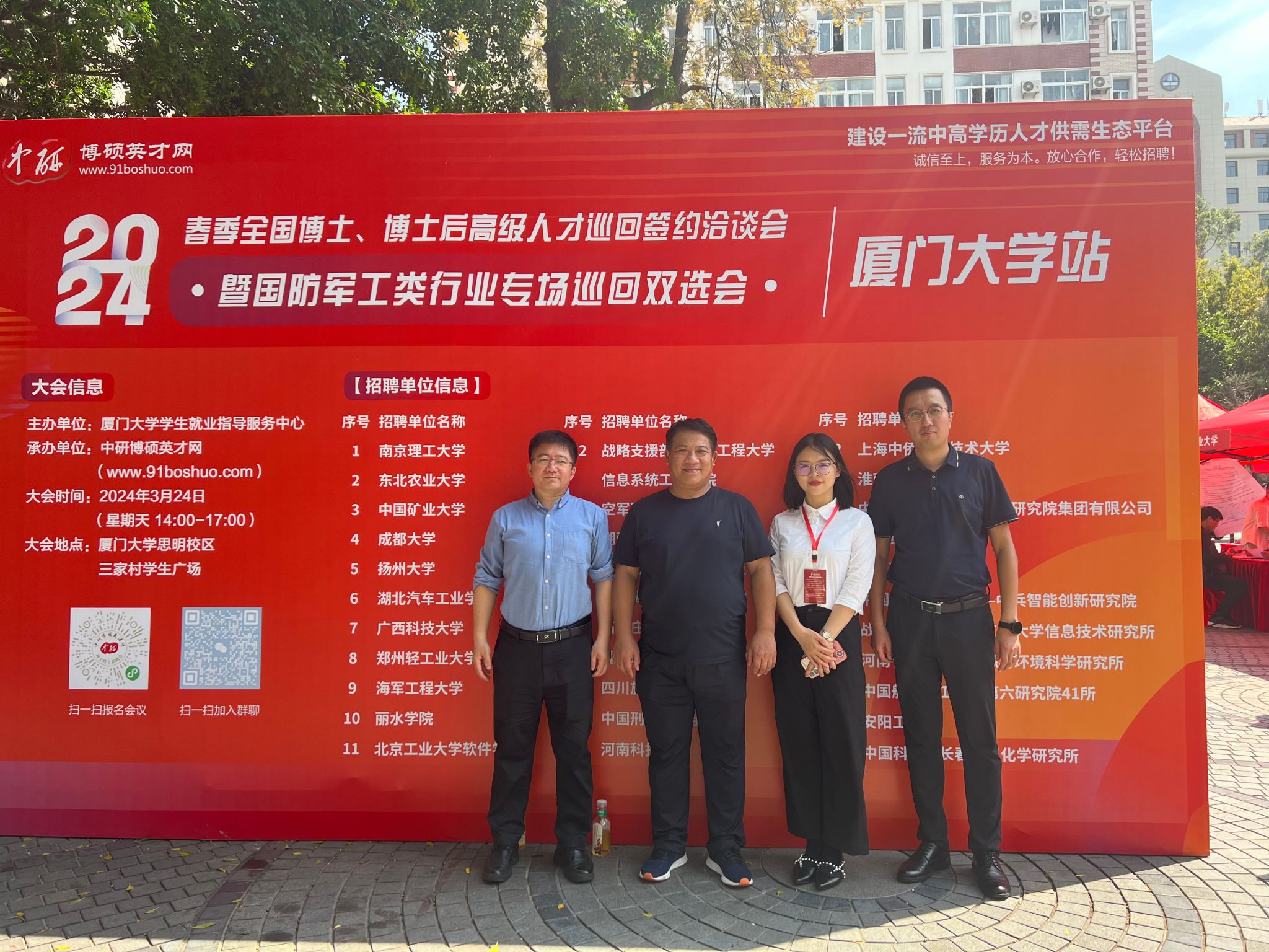 为扎实推进人才招聘工作,加大人才政策宣传力度,吸引更多优秀人才到国际文化教育学院工作,3月24日国际文化教育学院院长卢铁光带队参加2024年春季全国博士、博士后高级人才巡回签约洽谈会(厦门大学站),副院长胡长伟、副处级辅导员王富林、国际中文教育学科带头人冯红、汉语国际教育系主任赵宏陪同前往。