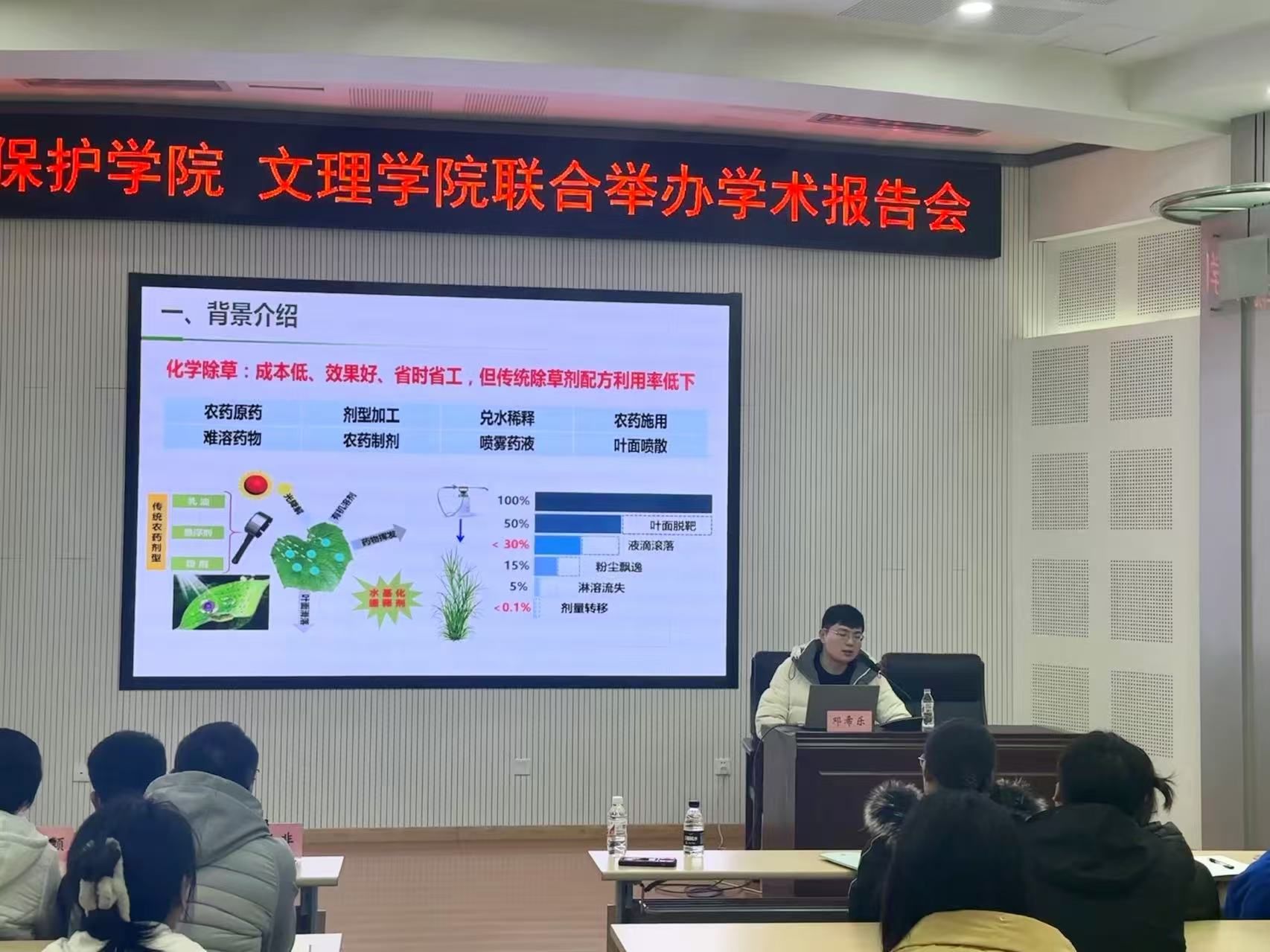 11月7日,植物保护学院、文理学院联合邀请湖南省农业科学院邓希乐研究员来校进行交流,并作题为“基于HLDP载体的新型恶唑酰草胺纳米制剂制备及增效解毒机制”的学术报告。植物保护学院国家高层次人才王相晶教授、文理学院院长付颖等60余位师生参加会议,会议由植物保护学院副院长程晓非主持。