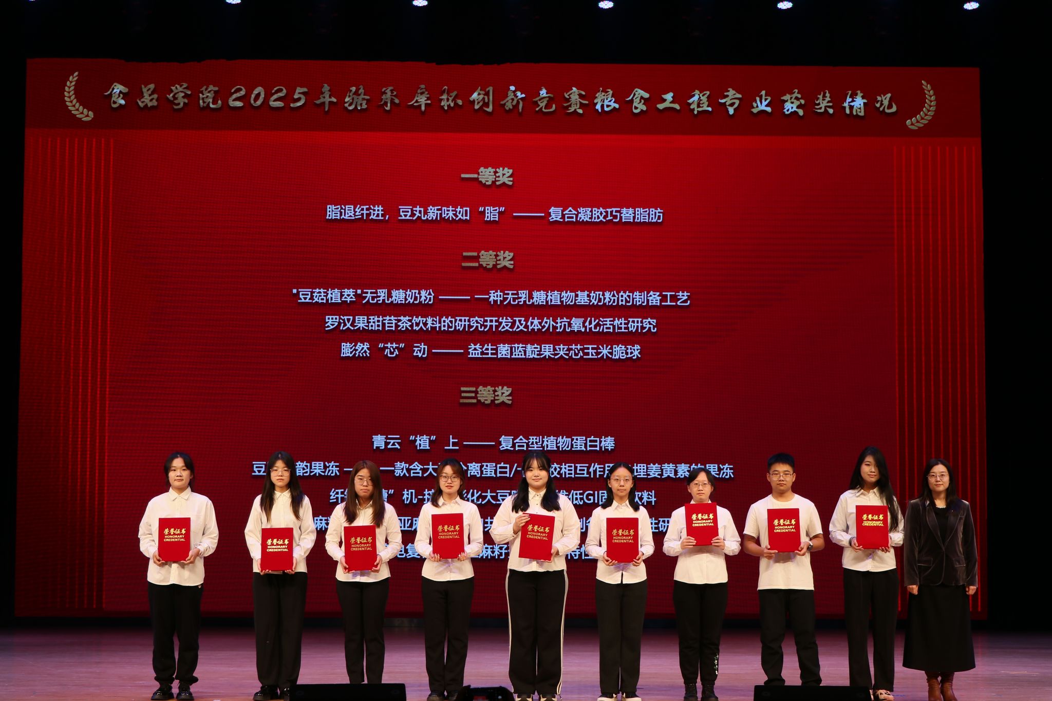 大会在庄严的国歌声中拉开序幕。“骆承庠杯”创新竞赛由2021年设立的“骆承庠教育基金”资助创办,以“传承学术薪火、激发创新活力”为核心使命。本届赛事自5月启动,历时5个月完成全流程角逐,吸引全院5个专业50支团队、百余名学生参赛,作品涵盖功能食品研发、科普视频制作等多个领域。最终评选出一、二、三等奖及优秀奖共50项,徐宁等5位教师获评“优秀指导教师”,夏宁等5位老师获评“优秀组织奖”。活动现场当晚,所有获奖队伍进行集中展示宣传,全方位呈现参赛作品的创新价值与实践成果。
