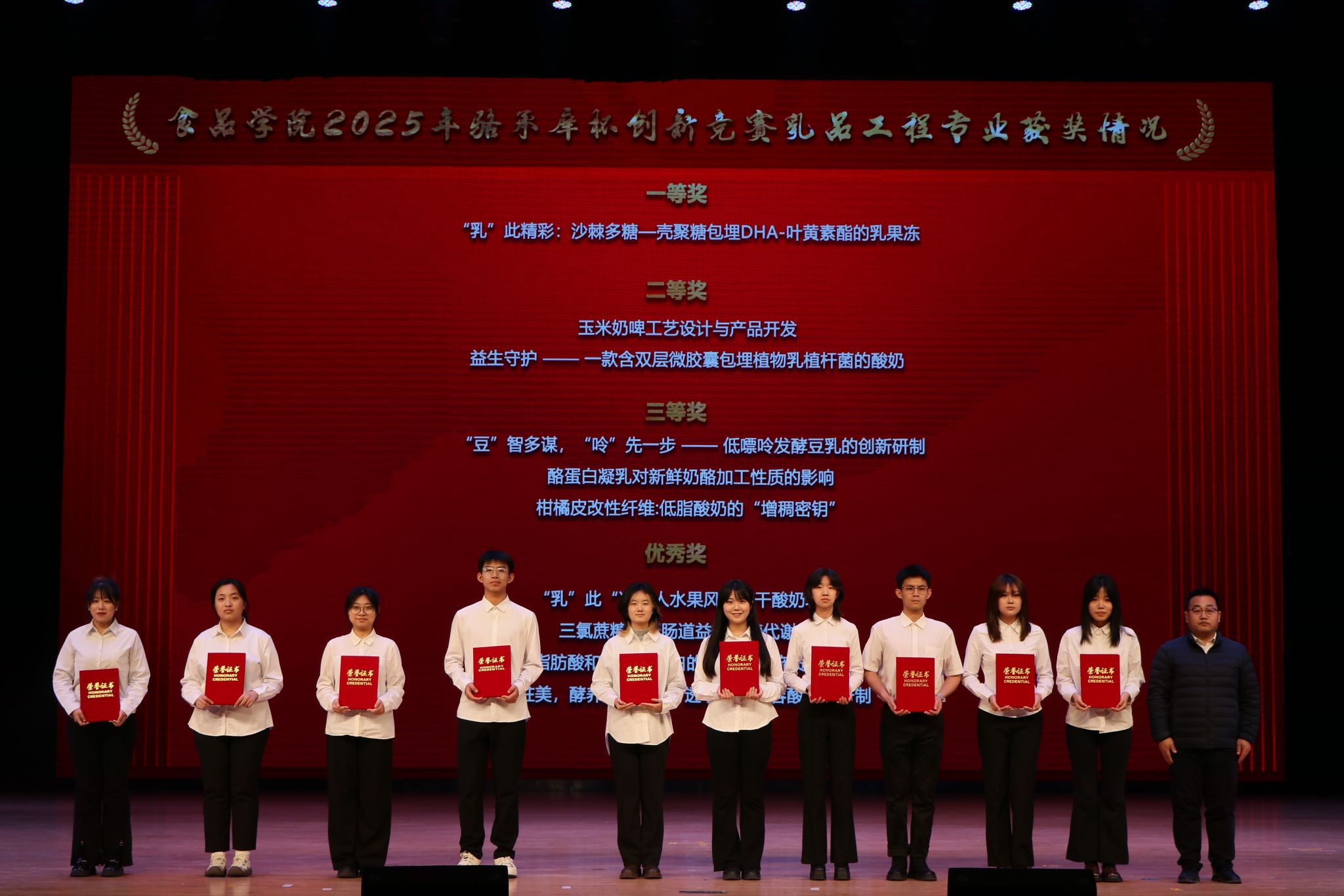 表彰环节中,与会领导依次为获奖团队及优秀指导教师颁奖。获奖学生代表上台分享科创实践感悟,传递食品学子“敢闯敢试、追求卓越”的精神风貌。