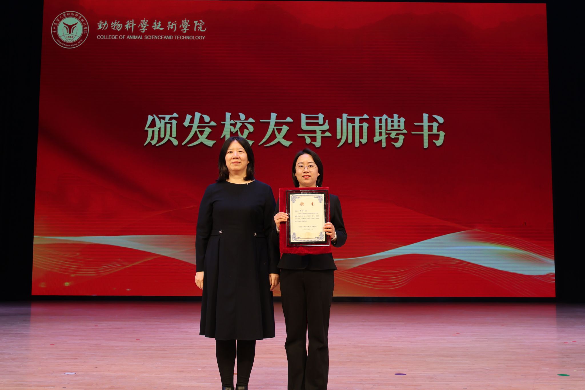 院长董娜为张萌颁发校友导师聘书。董娜表示,学院将持续依托世界一流学科建设优势,深化产学研用深度融合,优化人才培养体系,希望同学们传承耕读精神,树立“学畜牧、爱畜牧、干畜牧、强畜牧”的理想信念,在畜牧产业振兴的征程中书写青春华章。