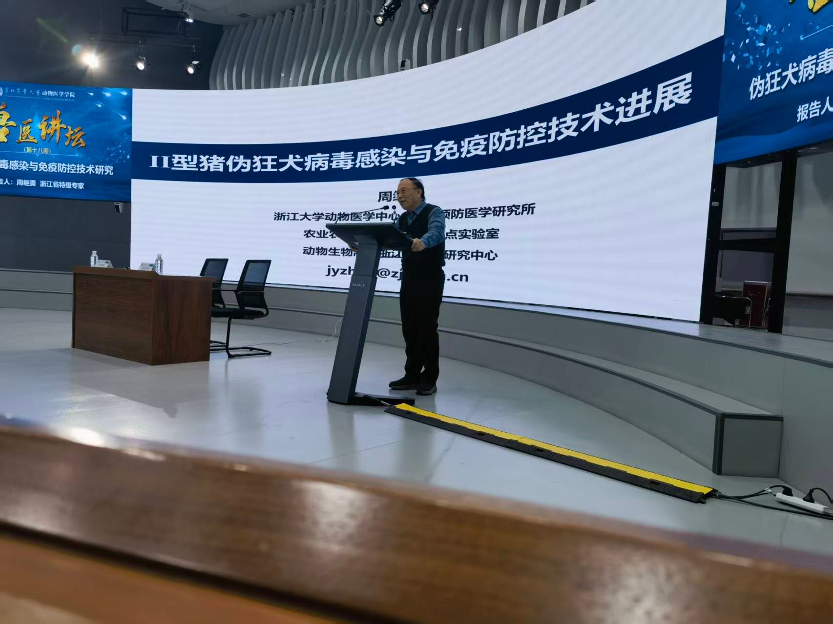 12月4日下午,动物医学学院举办第十八期兽医讲坛。本次讲坛特邀浙江省特级专家、浙江大学动物医学中心主任周继勇以《伪狂犬病毒感染与免疫防控技术研究》为题进行分享。学院领导班子、骨干教师、研究生及本科生代表参加讲坛。讲坛由学院院长李金龙主持。