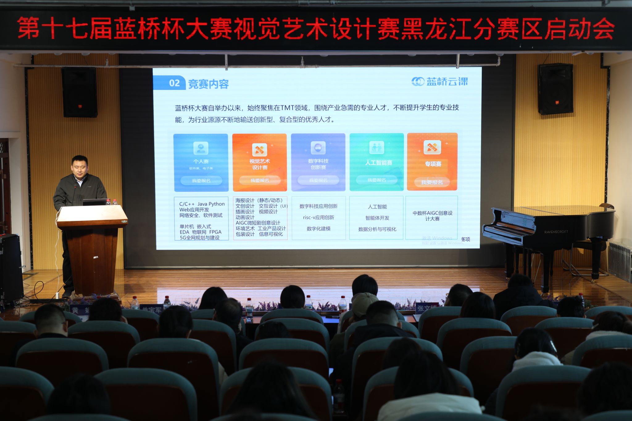 蓝桥杯大赛组委会秘书长李艳萍致辞,她介绍了大赛的宗旨与愿景,指出了平台在促进软件与信息技术、艺术设计人才培养方面的重要作用,并对黑龙江分赛区的组织工作寄予厚望。