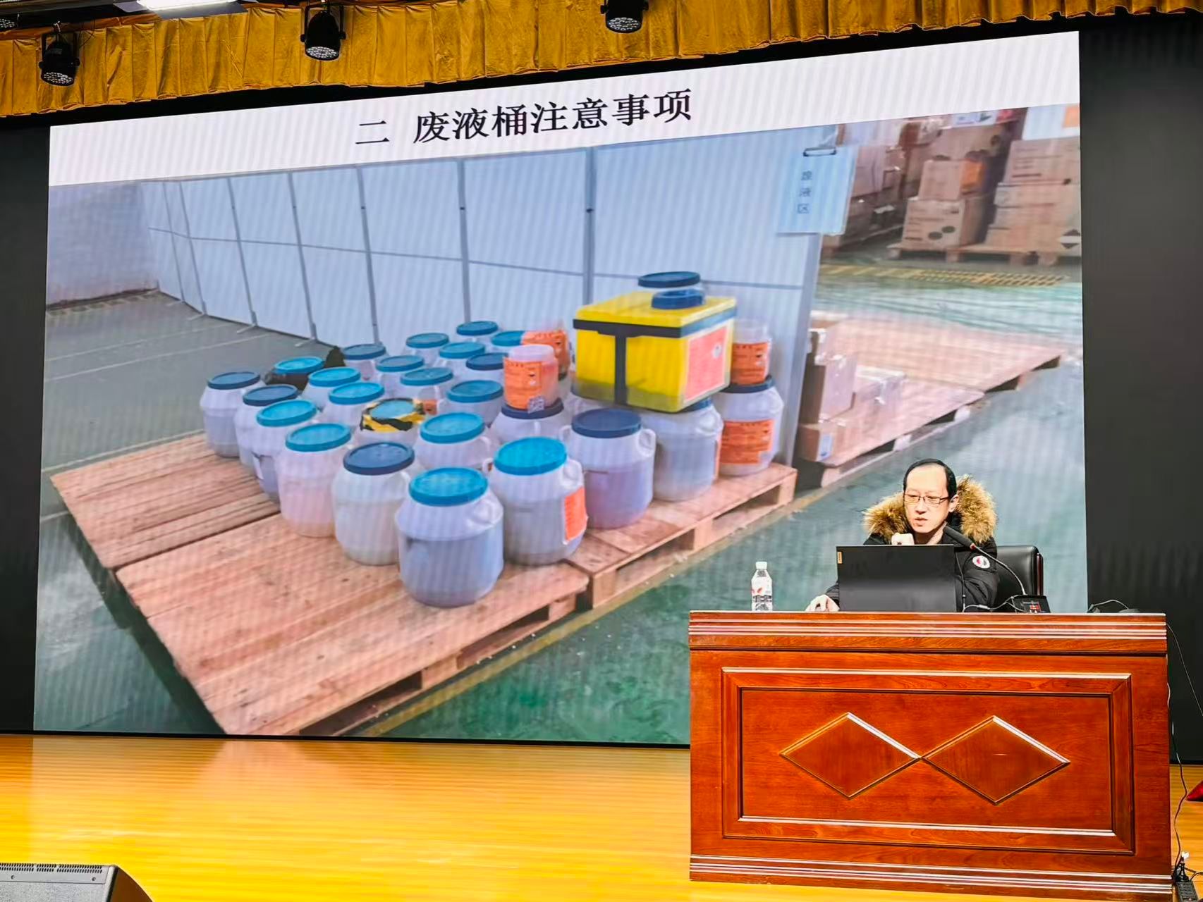 姚锐结合后勤管理处节能环保科关于危险废物处置的实践经验,围绕危废包装箱及废液桶注意事项、处置危废正确流程及生活垃圾与危险废物分装等内容进行讲解。他表示,实验室危废处置既要严守安全底线、确保操作合规达标,也要树立绿色节约理念,在规范处置的基础上兼顾资源高效利用,合理控制管理成本,杜绝不必要的资源浪费,实现安全与效益的双重保障。