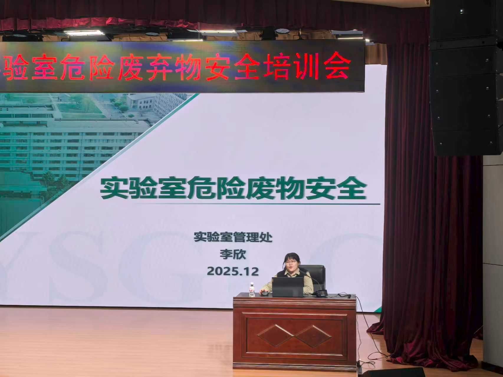 为进一步强化全校实验室安全管理水平,规范危险废物处置流程,防范实验室安全风险,12月16日下午,我校在图书馆一楼报告厅举办第十五期实验室安全讲堂暨实验室危险废物安全培训会。会议邀请实验室管理处技术安全科负责人李欣,后勤管理处节能环保科实验室危险废物处置负责人姚锐进行培训,来自公共基础教学实验中心和寒地黑土现代农业技术研究中心各科研团队的466名安全员和学生参加培训。会议由实验室管理处副处长白玉华主持。