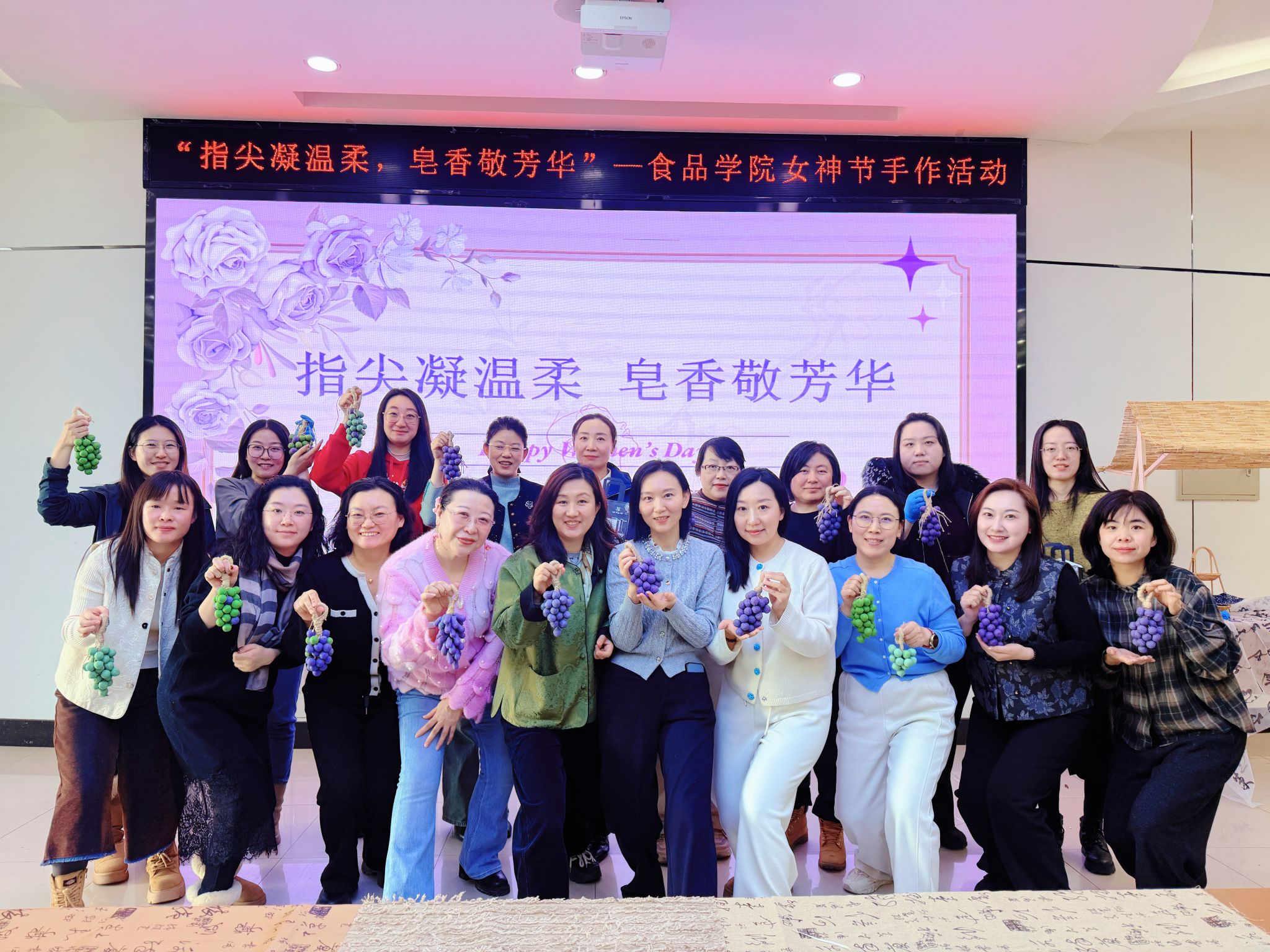 短短一个多小时,一串串造型精美、香气扑鼻的葡萄手工皂便陆续亮相。捧着自己亲手制作的作品,女教工们笑意盈盈,纷纷拍照留念,记录下这份独特的节日记忆。