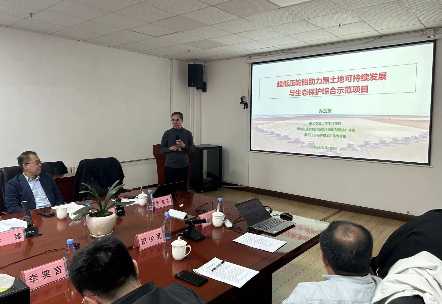 3月6日,以我校工程学院乔金友为首席专家的“超低压轮胎技术应用助力黑土地保护试验验证与示范”项目可行性评审会在贵州轮胎股份有限公司举行。评审会邀请中国农业机械工业协会会长赵剡水研究员、农业农村部农业机械化总站总工程师金红伟研究员、中国农业机械化研究院集团公司陈永毅研究员等7位评审专家。我校工程学院院长李岩、贵州轮胎股份有限公司、北大荒集团红兴隆分公司农业发展部、友谊农场有限公司、石家庄中兴机械制造股份有限公司负责人及相关人员参加会议。