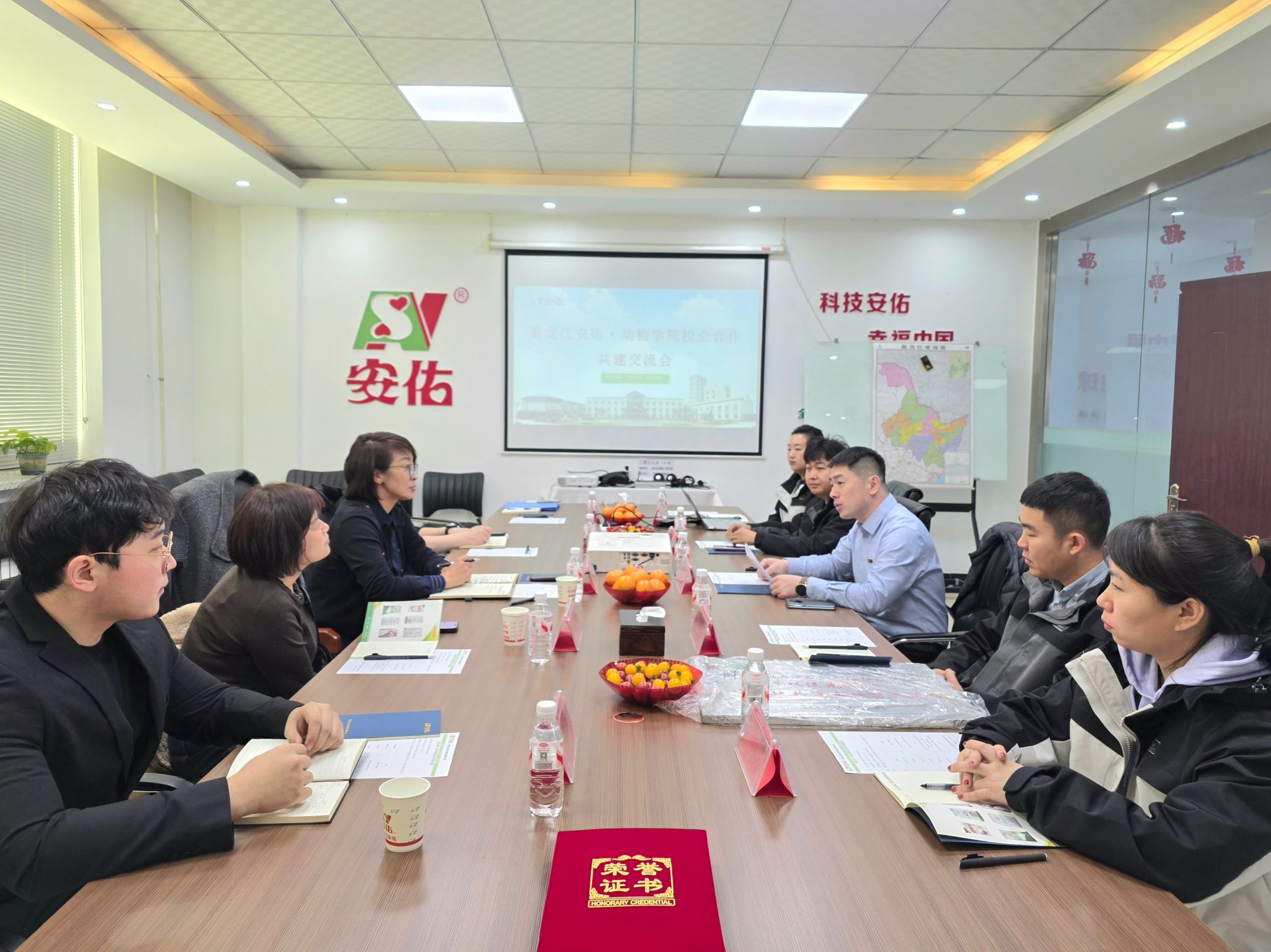 栾松介绍了学院的整体情况、党建工作与业务工作深度融合的具体举措及近年来取得的成效。她指出,此次党建联建共建交流是学院与安佑生物科技有限公司深化合作,推进校企协同育人的有效探索,希望双方以党建为引领,进一步在人才培养、科学研究、成果转化等领域拓展合作空间,共建“产学研用”协同平台、共育高素质畜牧人才、共筑社会服务品牌,实现资源共享、优势互补、互利共赢,共同为服务国家乡村振兴战略和畜牧业高质量发展注入新动能。