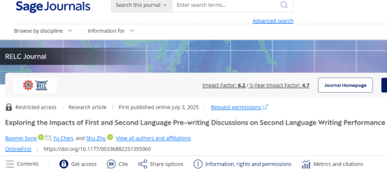 近日,文理学院宋宝梅教授在语言类国际知名学术期刊《RELC Journal》(中科院SSCI一区Top期刊)上发表了题为Exploring the Impacts of First and Second Language Pre-writing Discussions on Second Language Writing Performance的研究论文。