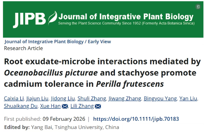 近日,我校农学院张丽莉教授团队与多家单位合作,在探究接种Oceanobacillus picturae如何通过调节碳水化合物代谢物重塑紫苏根际微生物群落,从而缓解镉毒性方面取得新进展,在《Journal of Integrative Plant Biology》发表题为“Root Exudate‑Microbe Interactions Mediated by Oceanobacillus picturae and Stachyose Promote Cadmium Tolerance inPerilla frutescens”研究论文。该研究揭示了O. picturae通过重塑根系分泌物组成、诱导水苏糖分泌,进而招募耐镉促生微生物,从而增强紫苏对镉胁迫的耐受性。