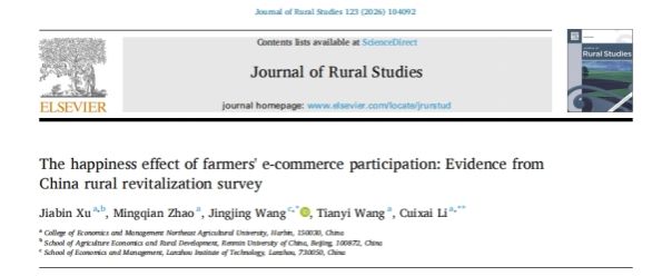 近日,我校经济管理学院青年教师许佳彬在国际知名期刊《Journal of Rural Studies》(IF=5.7,中科院SSCI一区Top,ABS三星期刊)正式发表了“The happiness effect of farmers’e-commerce participation: Evidence from China rural revitalization survey”研究论文,揭示了农民电商参与对幸福感的影响机制。我校兼职教授李翠霞为该论文通讯作者,我校为第一署名单位。
