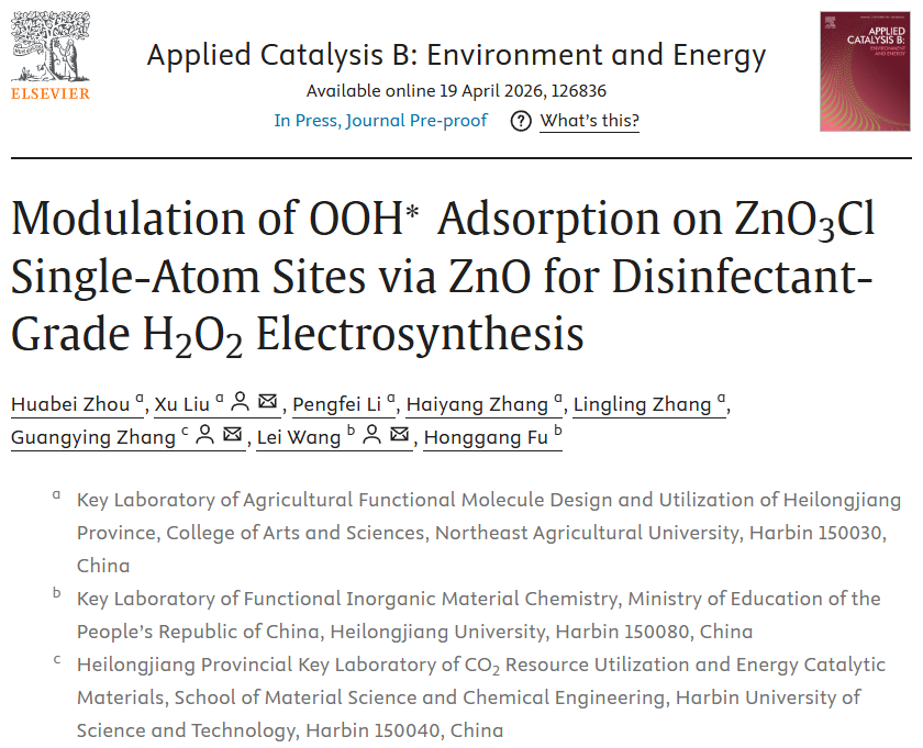 近日,东北农业大学文理学院副教授刘旭在Applied Catalysis B: Environment and Energy(IF=21.1,中科院1区Top期刊)上发表了题为“Modulation of OOH* Adsorption on ZnO3Cl Single-Atom Sites via ZnO for Disinfectant-Grade H2O2Electrosynthesis”的研究论文,东北农业大学为第一署名单位。