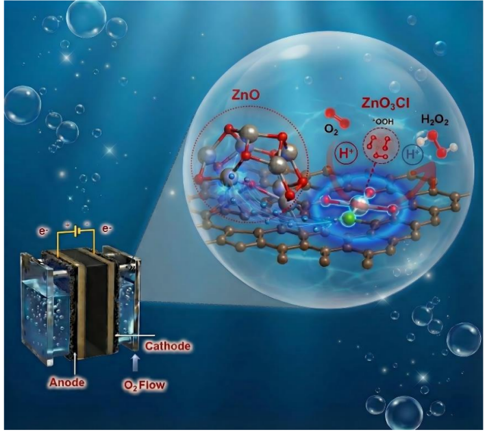 针对当前H2O2工业生产中普遍使用的蒽醌法存在高能耗、多步骤和废弃物等问题,本研究开发了一种高效、稳定的2e⁻ ORR电催化剂。该催化剂以葡萄糖衍生的碳球为载体,通过ZnCl2/KCl熔盐热解原位生成ZnO纳米晶和ZnO3Cl单原子位点,具有高比表面积(1003.79 m2/g)和分级多孔结构。该催化剂在流动池中实现了34.32 mol g⁻1h⁻1的H2O2产率,并在250 mA cm⁻2下稳定运行60小时,可直接获得3.5 wt%的消毒级H2O2溶液。此外,电合成的H2O2成功应用于有机污染物降解、金黄色葡萄球菌灭活及苯甲酰胺的合成,展示了其在环境治理、消毒和绿色合成中的广阔应用前景。Operando ATR-FTIR和Raman光谱证实OOH*为关键中间体,并且生成的H2O2可快速在活性位点脱附。DFT表明ZnO纳米晶通过调控ZnO3Cl位点的d带中心,优化了OOH*吸附能,抑制了4e⁻路径,提升了H2O2选择性(最高91.12%)。该研究为可持续、规模化电合成H2O2提供了新策略。