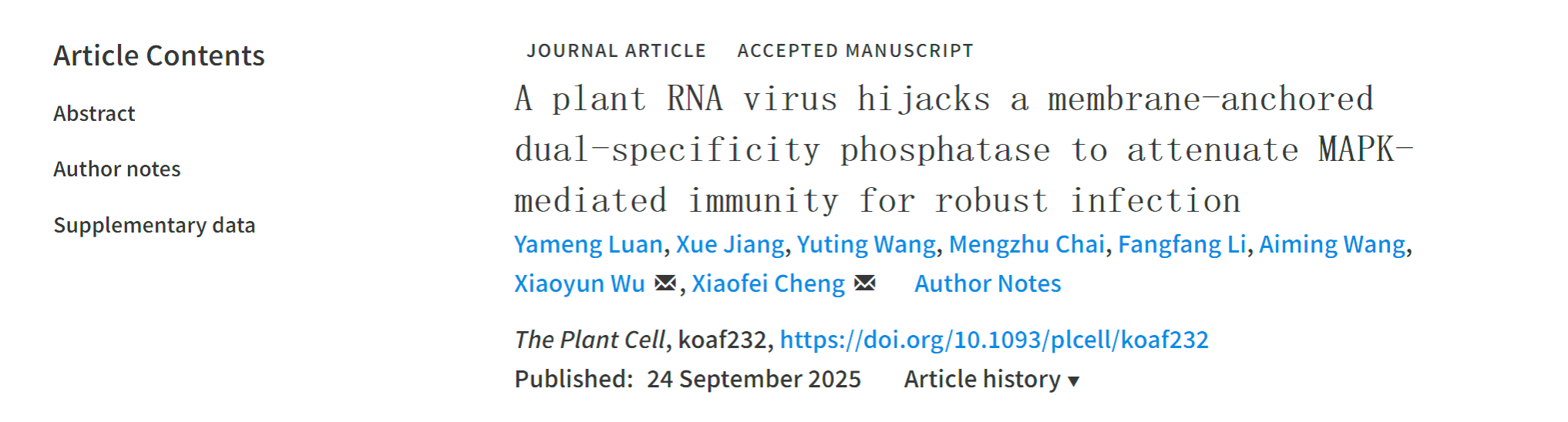 9月24日,我校植物保护学院程晓非教授团队在中科院1区Top期刊《Plant Cell》(IF5 years=12.1)在线发表题为《A plant RNA virus hijacks a membrane-anchored dual-specificity phosphatase to attenuate MAPK-mediated immunity for robust infection》的研究论文。研究揭示了植物双特异性磷酸酶(Dual specificity phosphatase,DSP)在芜菁花叶病毒(turnip mosaic virus,TuMV)侵染中的作用,阐明了TuMV的P3蛋白能够利用DSP4抑制丝裂原活化蛋白激酶(Mitogen-activated protein kinases,MAPK)介导的植物抗病毒反应,从而促进病毒致病的新机制。本论文得到《Plant Cell》当期In brief专题评述。