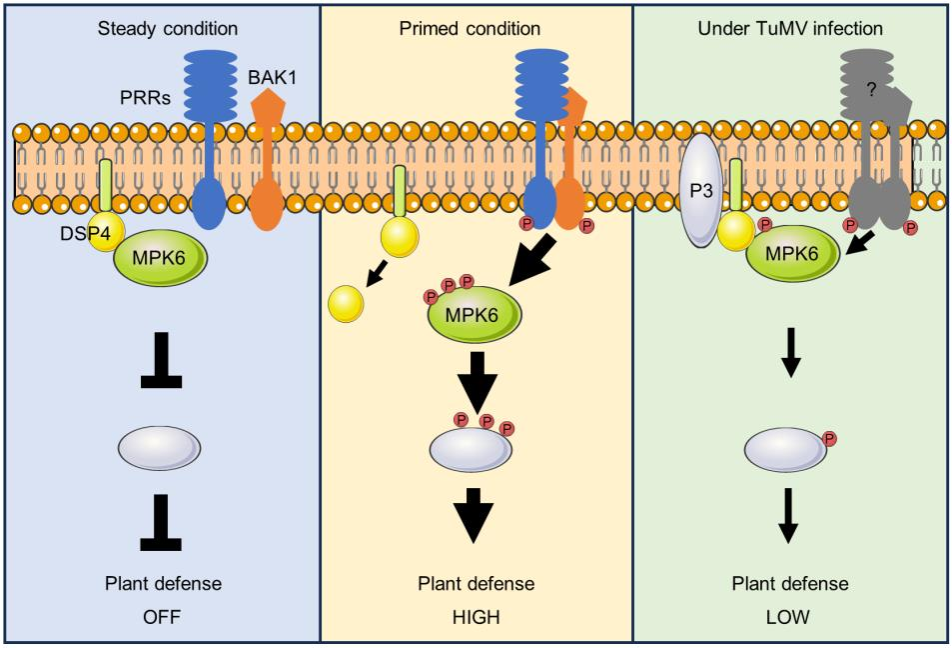 MAPK级联途径是植物响应环境胁迫的关键磷酸化信号通路。非典型DSPs是植物特有的一类蛋白磷酸酶,能够通过负调控MAPK的活性来调控植物对非生物胁迫的抗性。该论文以马铃薯Y病毒属(Potyvirus)的TuMV为模式病毒,报道了DSP4促进病毒侵染的分子机制。该研究发现,DSP4通过C末端翻译后修饰锚定在细胞内膜上,膜定位的DSP4与MPK6、MPK3互作并使其去磷酸化,进而维持正常条件下植物MAPK级联途径的抑制状态,避免植物免疫被错误激活;在病原侵染条件下,DSP4从膜上脱落,保证MAPK级联途径和植物免疫的高效激活;而在TuMV侵染条件下,病毒的P3蛋白胁持DSP4,增强其膜定位,以促进DSP4对MPK的去磷酸化,抑制MAPK级联途径的激活,以促进病毒侵染。该研究深化了我们对马铃薯Y病毒属病毒致病机制的理解,也为未来大豆、马铃薯等作物的抗病毒抗性改良奠定了理论基础。