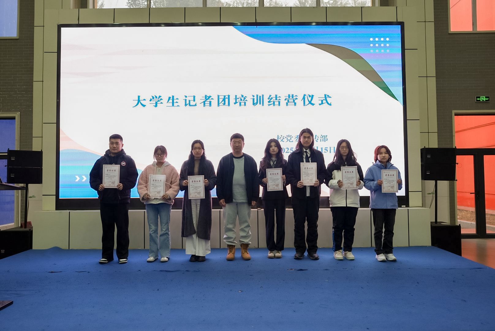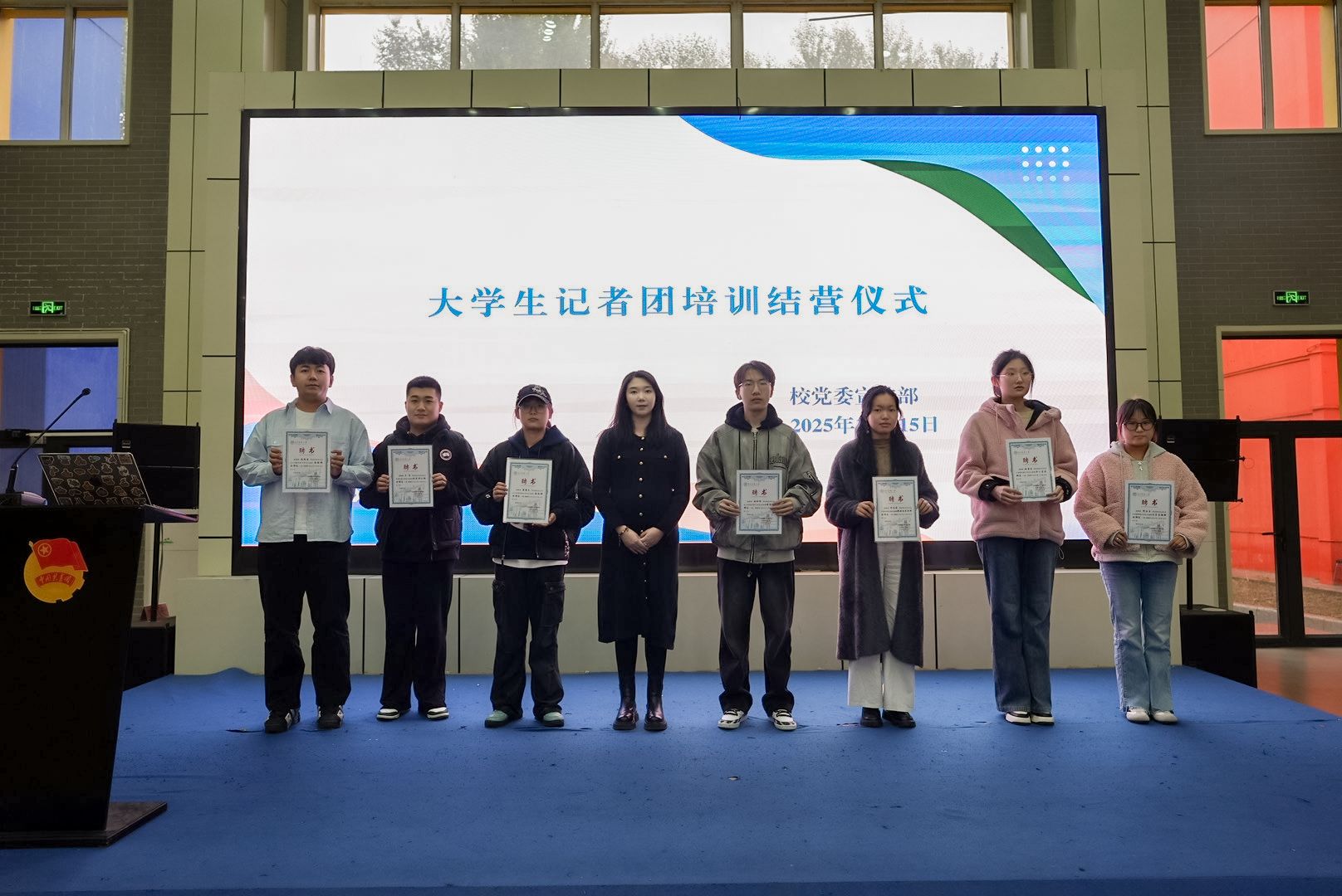 结营式上,大学生记者团表彰大会同期举行。对2024-2025年度的团长、部长等颁发了聘书;对2024-2025年度的优秀学生记者颁发了荣誉证书。