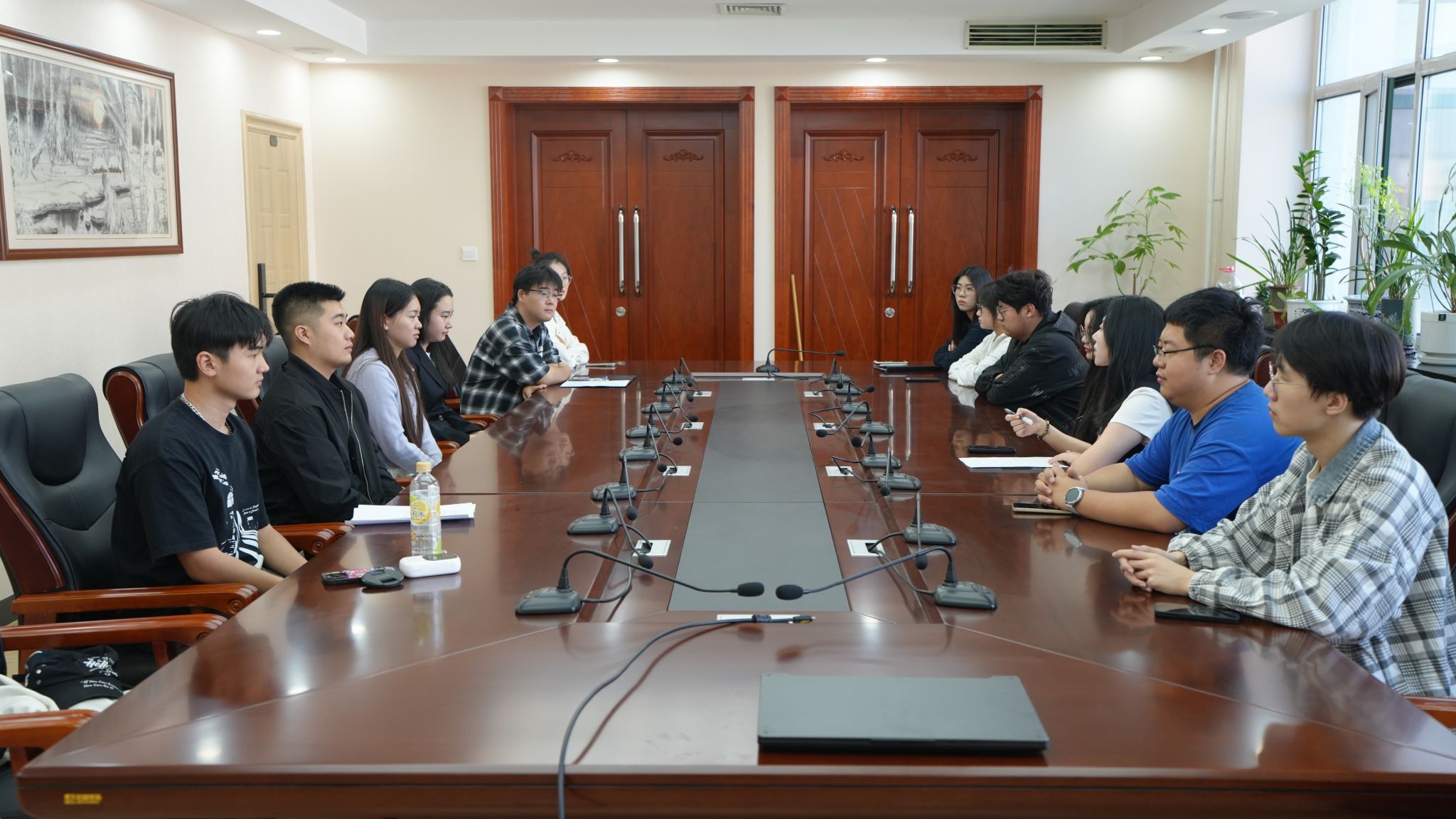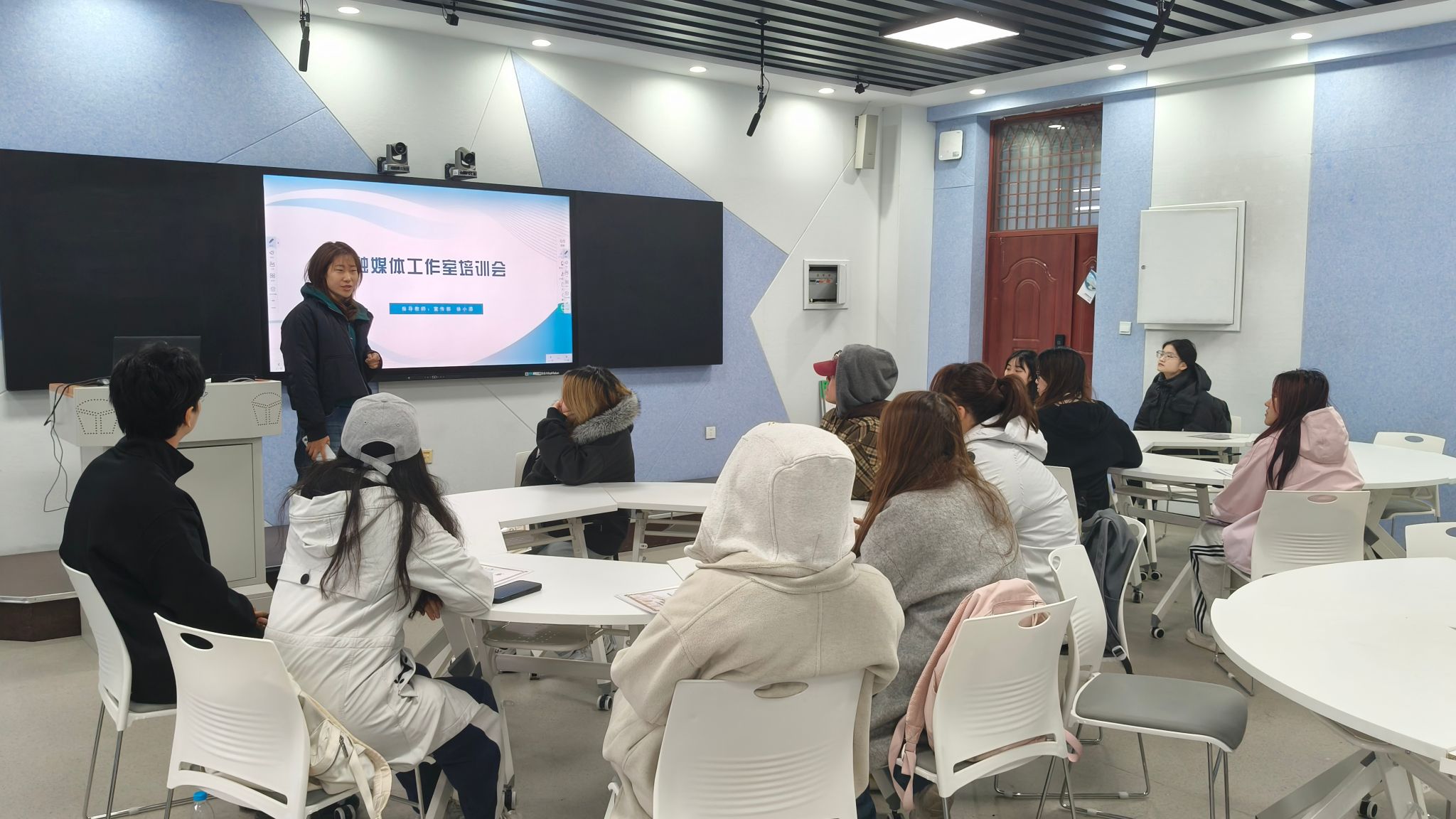 融媒体工作部指导教师徐小添组织记者团成员参观学校新媒体演播室并召开座谈会,让记者们直观感受“策、采、编、传、评、存”全流程融媒产品作业流程。她勉励记者们要珍惜平台,发挥所长,敢于创新,做出有温度、有力量的融媒体好作品。