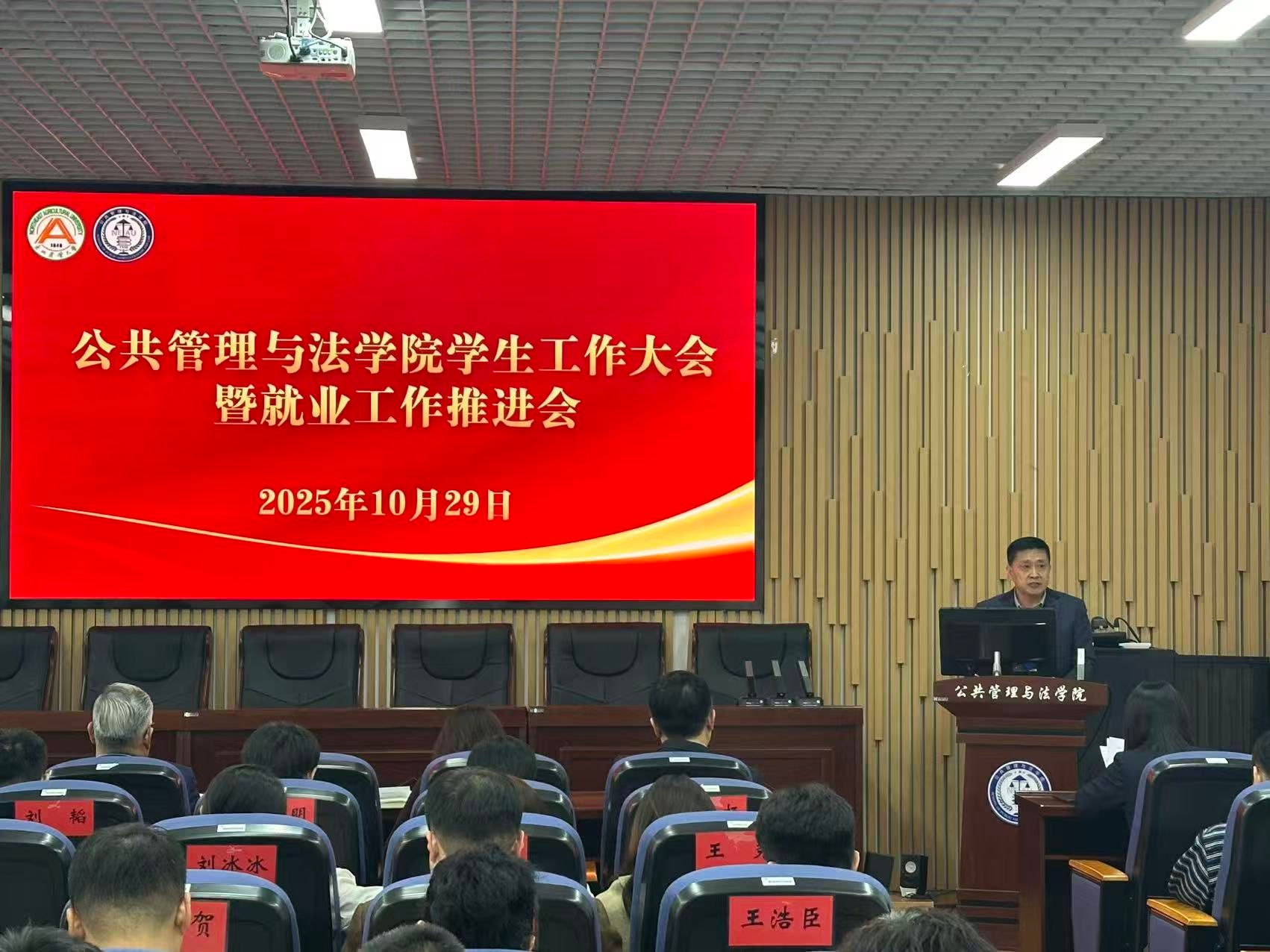 10月29日,公共管理与法学院在成栋楼1104召开学生工作大会暨2026届毕业生就业工作推进会。学院领导班子及全体教师参加会议。会议由学院党委副书记赵文和主持。