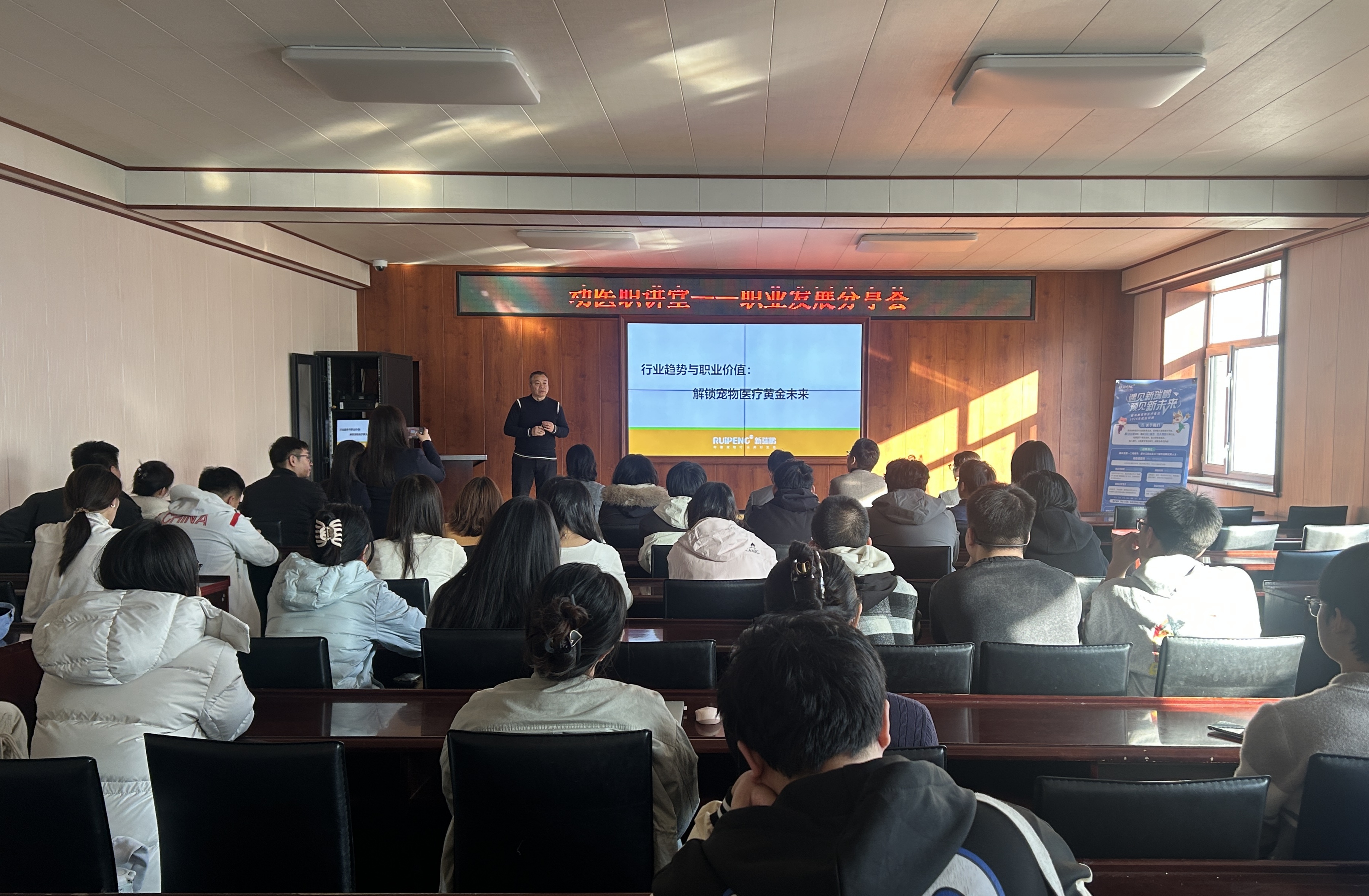 会后,学院举办了 “动医职讲堂 —— 职业发展分享荟”。刘郎结合自身从业经历,为在场学生解读了宠物医疗行业的发展历程、目前阶段的就业趋势、岗位需求及职业发展路径。集团人资负责人赵鑫泽围绕AI时代职业选择进行了讲解。集团东北区总经理助理高常军向学生们介绍集团2025秋招岗位需求、招聘流程及内部晋升通道,向意向学子提供“一站式求职指南”。在答疑环节,集团工作人员与学生进行互动交流,解答学生在专业学习、职业规划方面的疑问。
