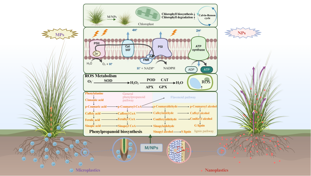 微/纳米塑料作为全球瞩目的新兴污染物,其危害已引发广泛关注。以往研究多集中于水生植物、模式植物及农作物对微纳米塑料的响应,而对陆生植物的生态效应认识有限。本研究以极具生态价值的羊草为研究对象,探究50 nm和20 μm两种粒径的聚甲基丙烯酸甲酯(PMMA)对其生理生化及分子水平的影响。结果表明,两种粒径N/MPs均对羊草产生负面影响,表现为生长受阻、叶绿素含量下降、光合作用减弱及氧化应激加剧,且小粒径和高浓度处理的毒性更强。通过荧光可视化与定量分析发现,小粒径主要经外质体途径进入体内,而大粒径则因尺寸效应对根系造成机械损伤。转录组学分析显示,不同粒径处理显著富集与胁迫响应相关的多种通路基因表达。值得注意的是,羊草可通过调节抗氧化系统、积累脯氨酸及启动苯丙烷生物合成途径,增强对N/MPs胁迫的耐受性与解毒能力。综上,本研究不仅进一步揭示了PMMA对羊草的毒性机制,也为利用陆生植物修复微纳米塑料污染土壤提供了新策略。