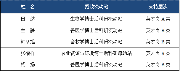 根据《东北农业大学全职博士后支持计划实施办法》(东农人字〔2025〕28号)的有关规定和要求,学校近期开展了2025年第三批全职博士后招收工作,经个人申请、培养及设站学院遴选推荐、人事处审核,由学校2025年第7次人才工作委员会审议,2025年第17次校长办公会、四届22次校党委常委会审议通过,2025年第三批全职博士后招收共有5人符合进站条件,现将人员名单及支持层次予以公示: